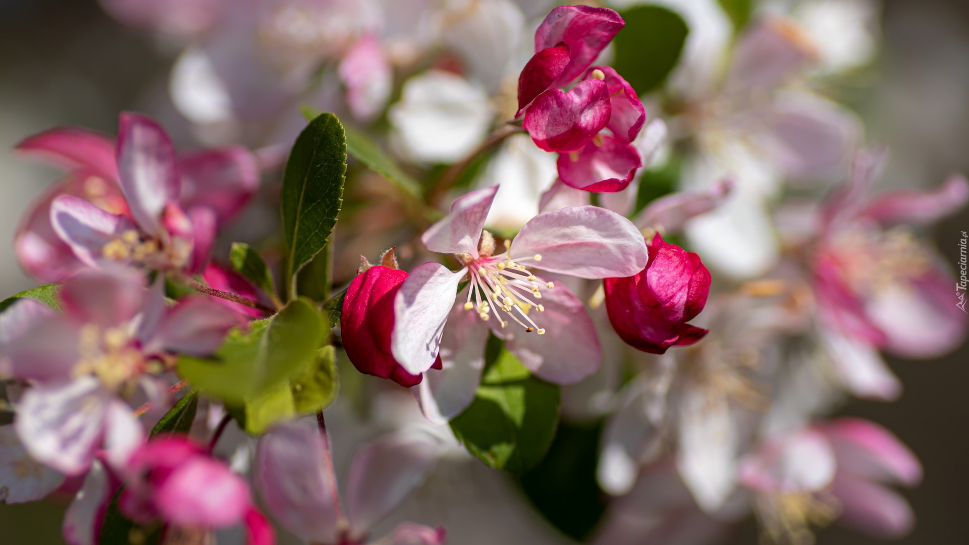 Edytor tapety: Kwitnąca gałązka jabłoni na rozmytym tle