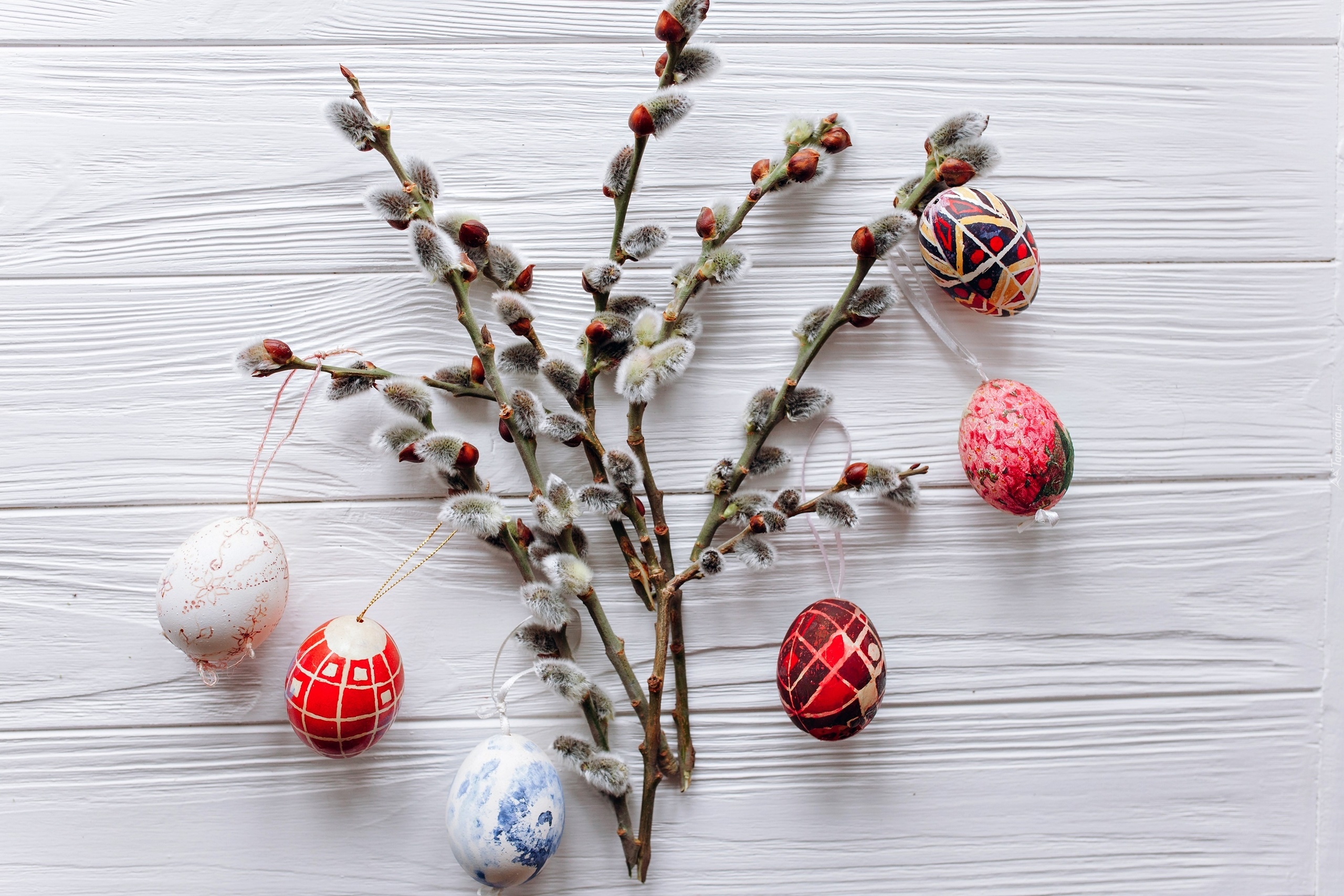 Edytor tapety: Bazie i kolorowe pisanki na białych deskach