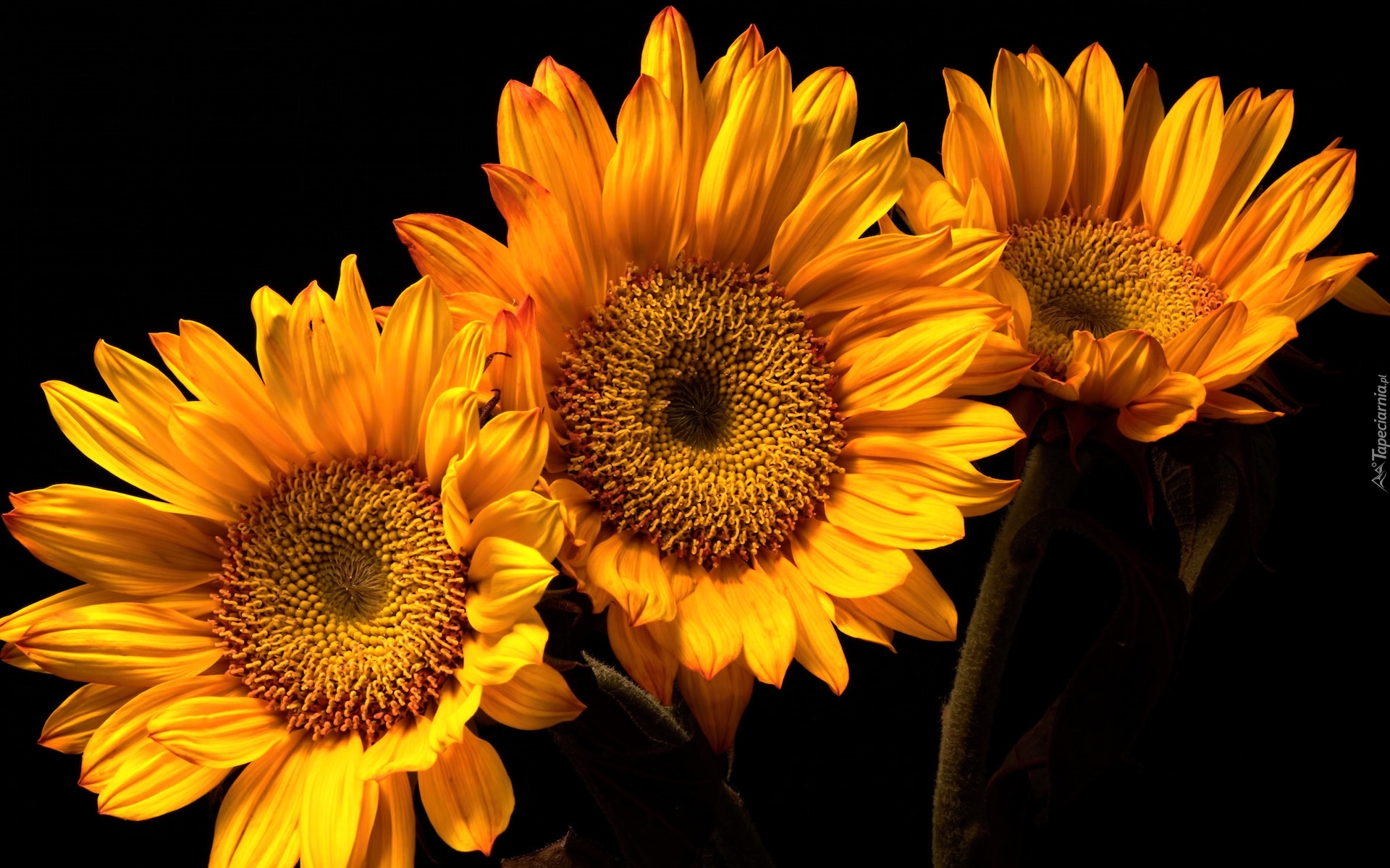 Edytor tapety: Trzy kwiaty słonecznika na czarnym tle