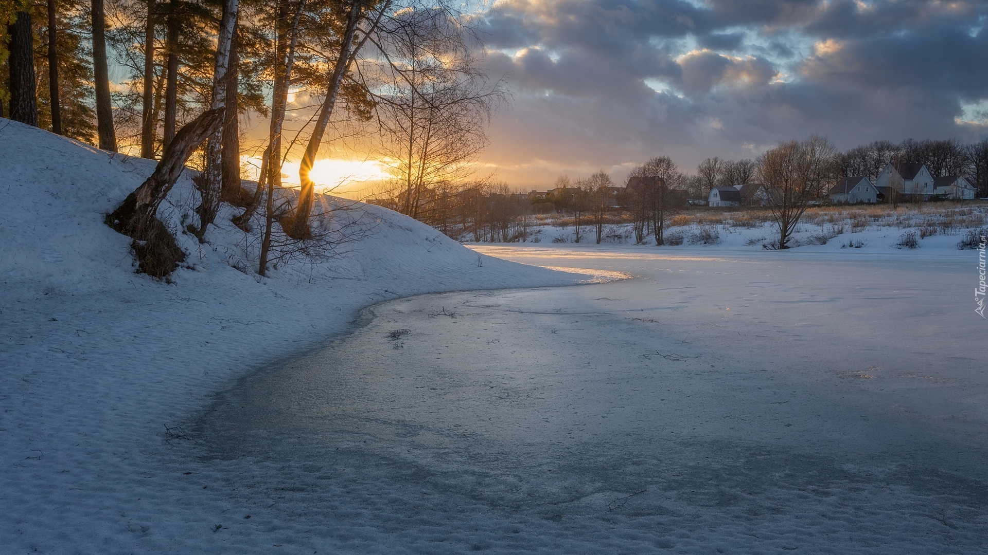 Edytor tapety: Drzewa na skarpie nad oblodzoną rzeką