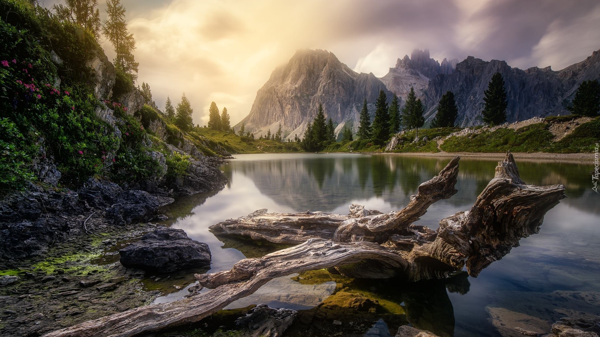 Edytor tapety: Suchy konar w jeziorze na tle gór
