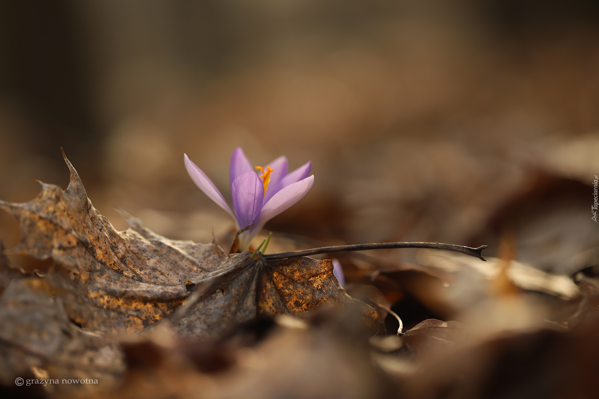 Edytor tapety: Rozkwitający krokus w suchych liściach