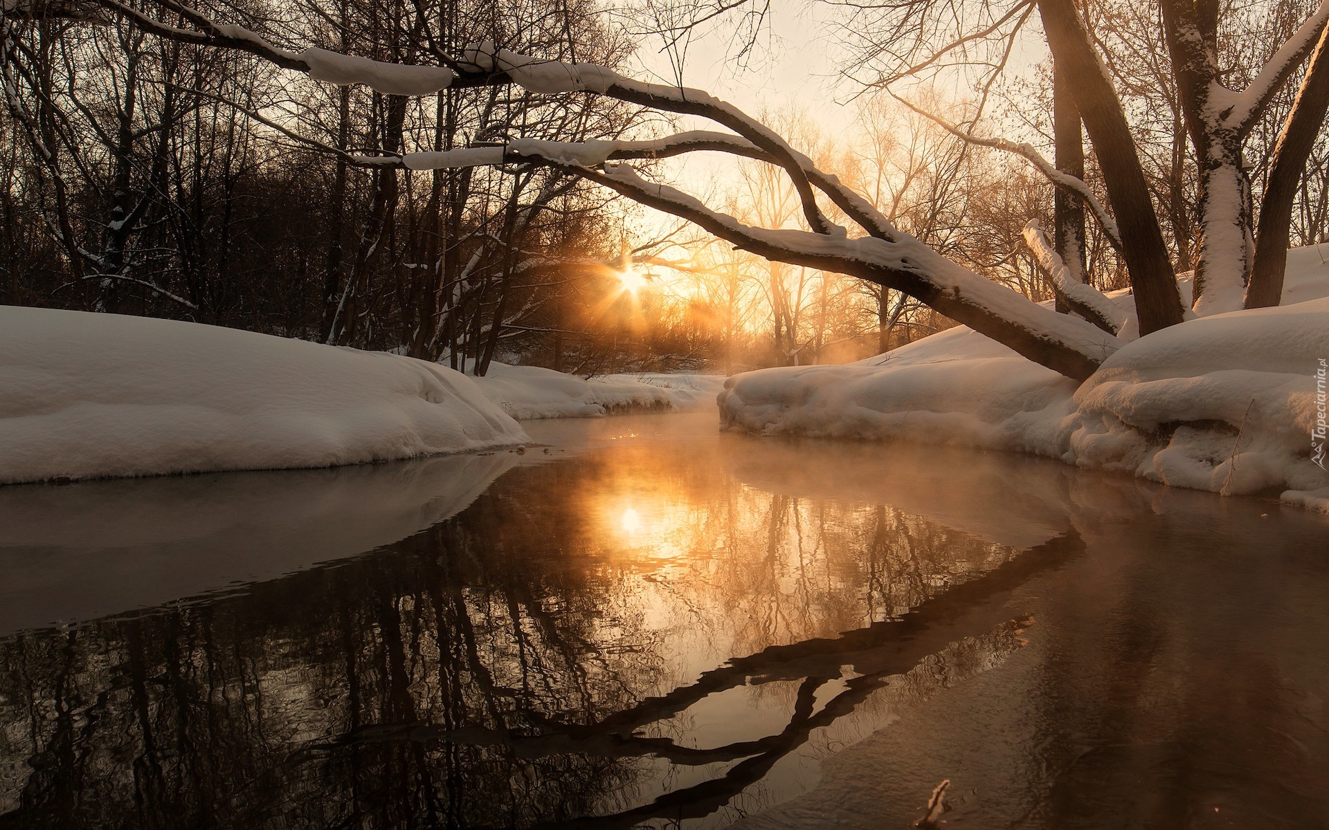 Edytor tapety: Ośnieżone drzewo pochylone nad rzeką w słonecznych promieniach