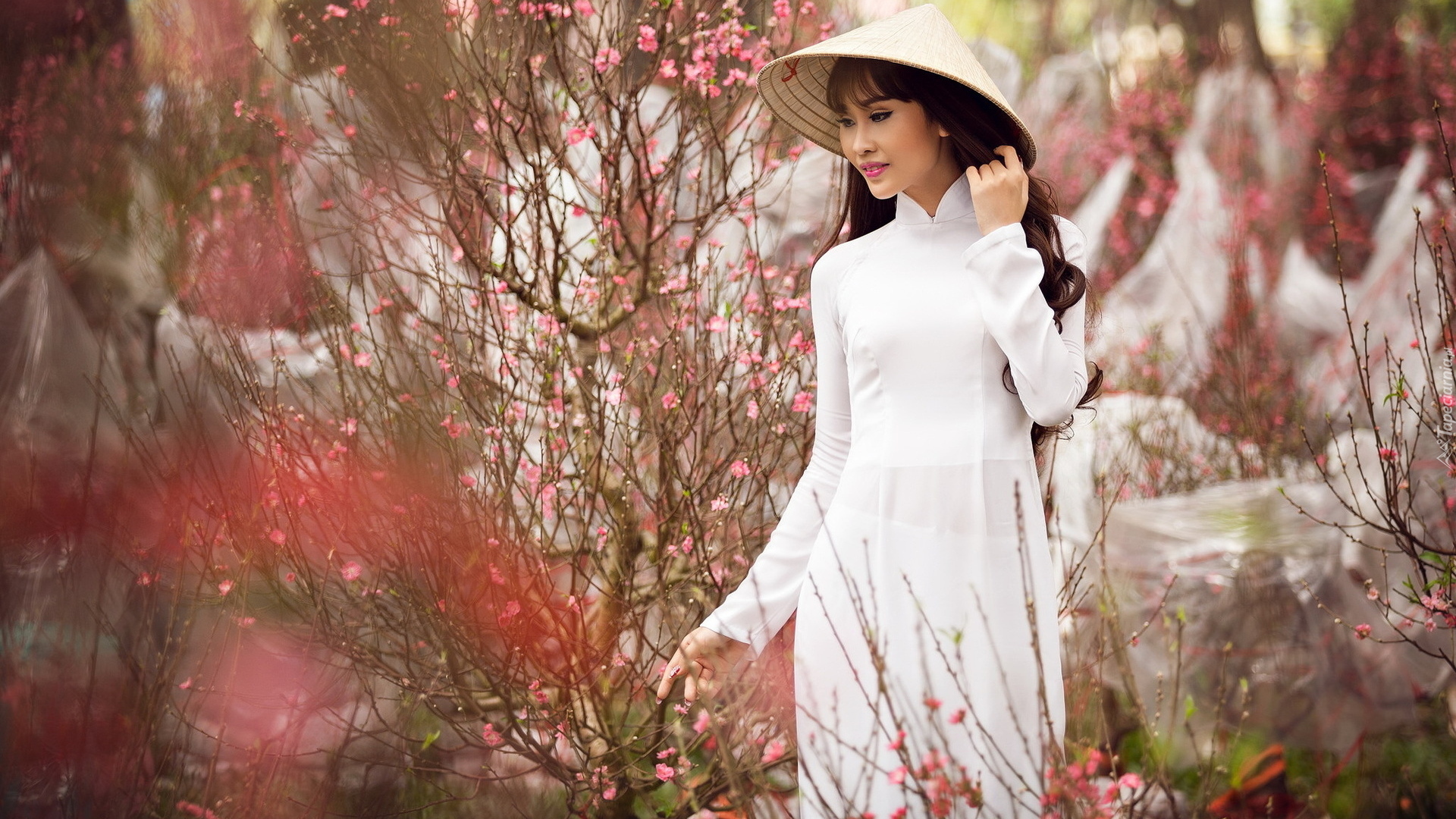 Edytor tapety: Azjatka w kapeluszu i białej sukni