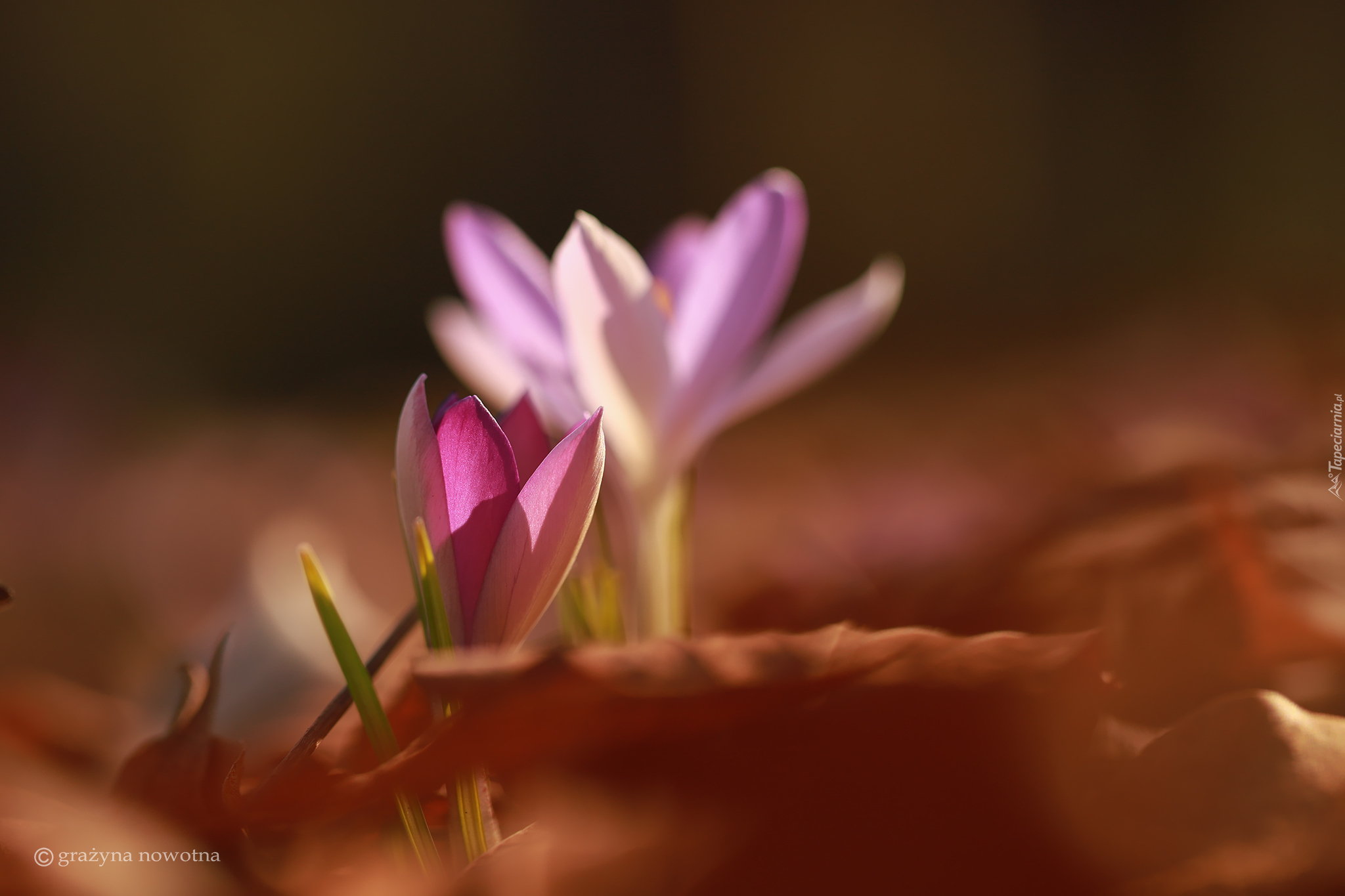 Edytor tapety: Fioletowe krokusy w słonecznym blasku