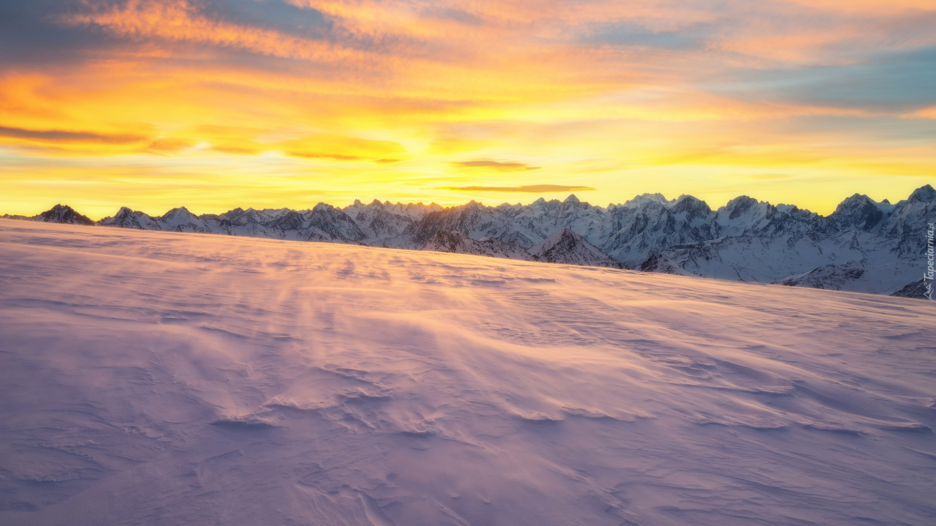 Edytor tapety: Zachód słońca nad ośnieżoną polaną w górach