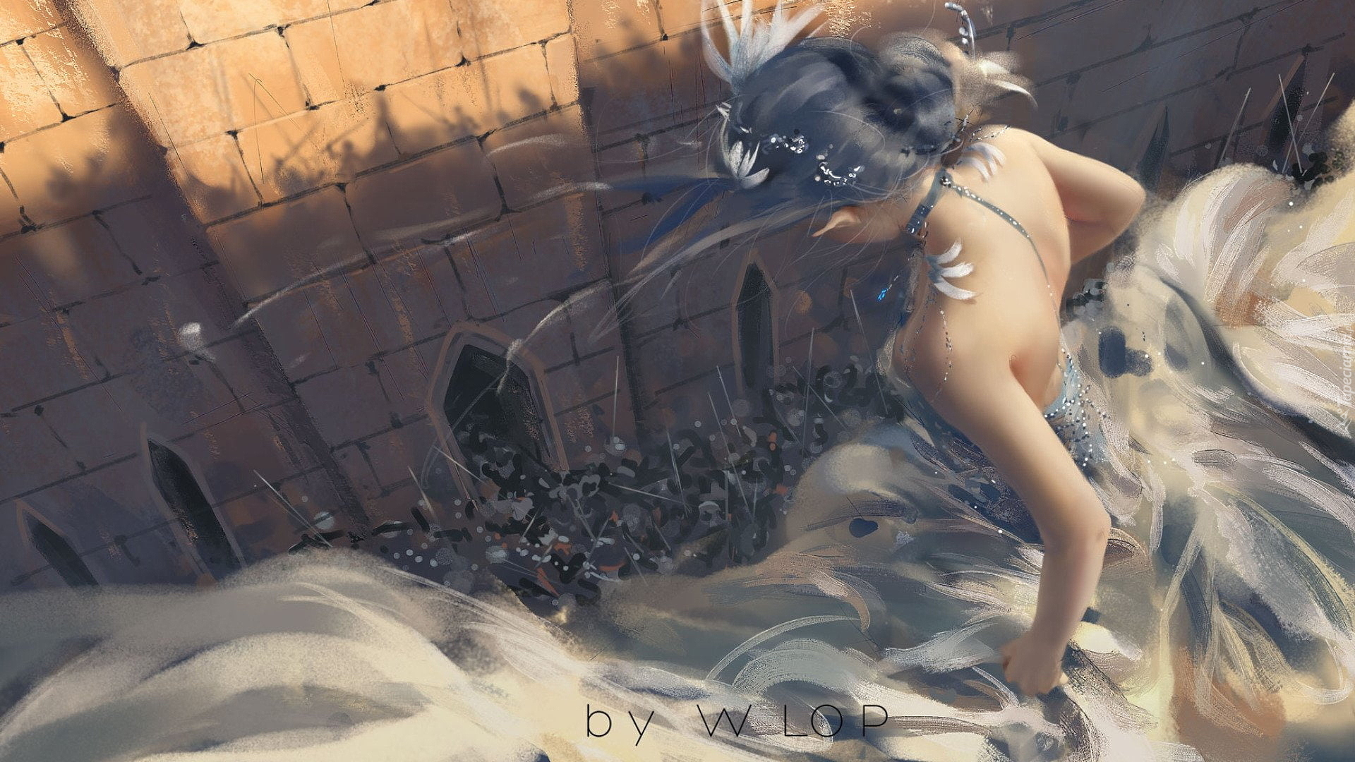 Edytor tapety: Dziewczyna elf spoglądająca na tłum przy murze