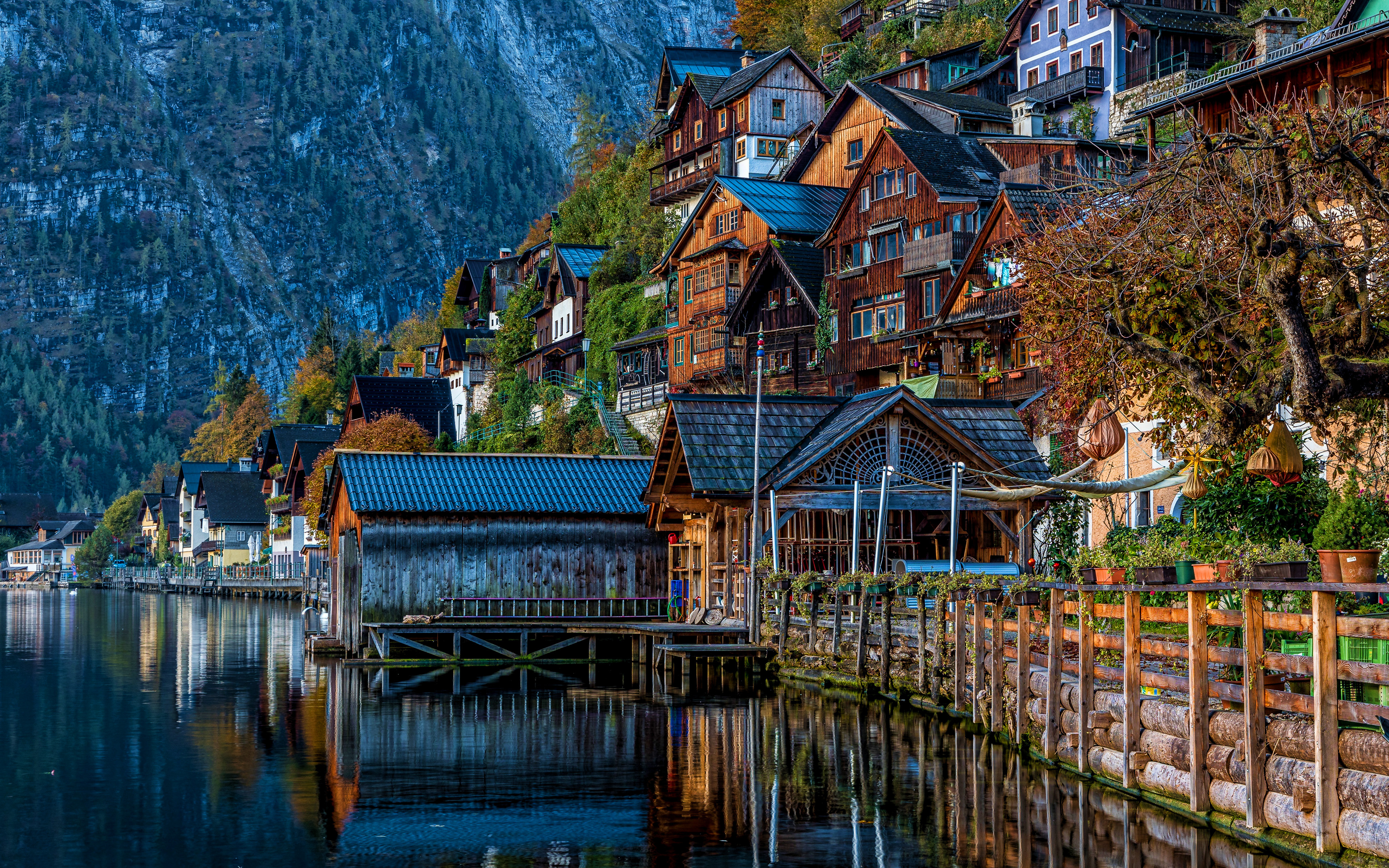 Edytor tapety: Domy nad jeziorem Hallstattersee w Alpach