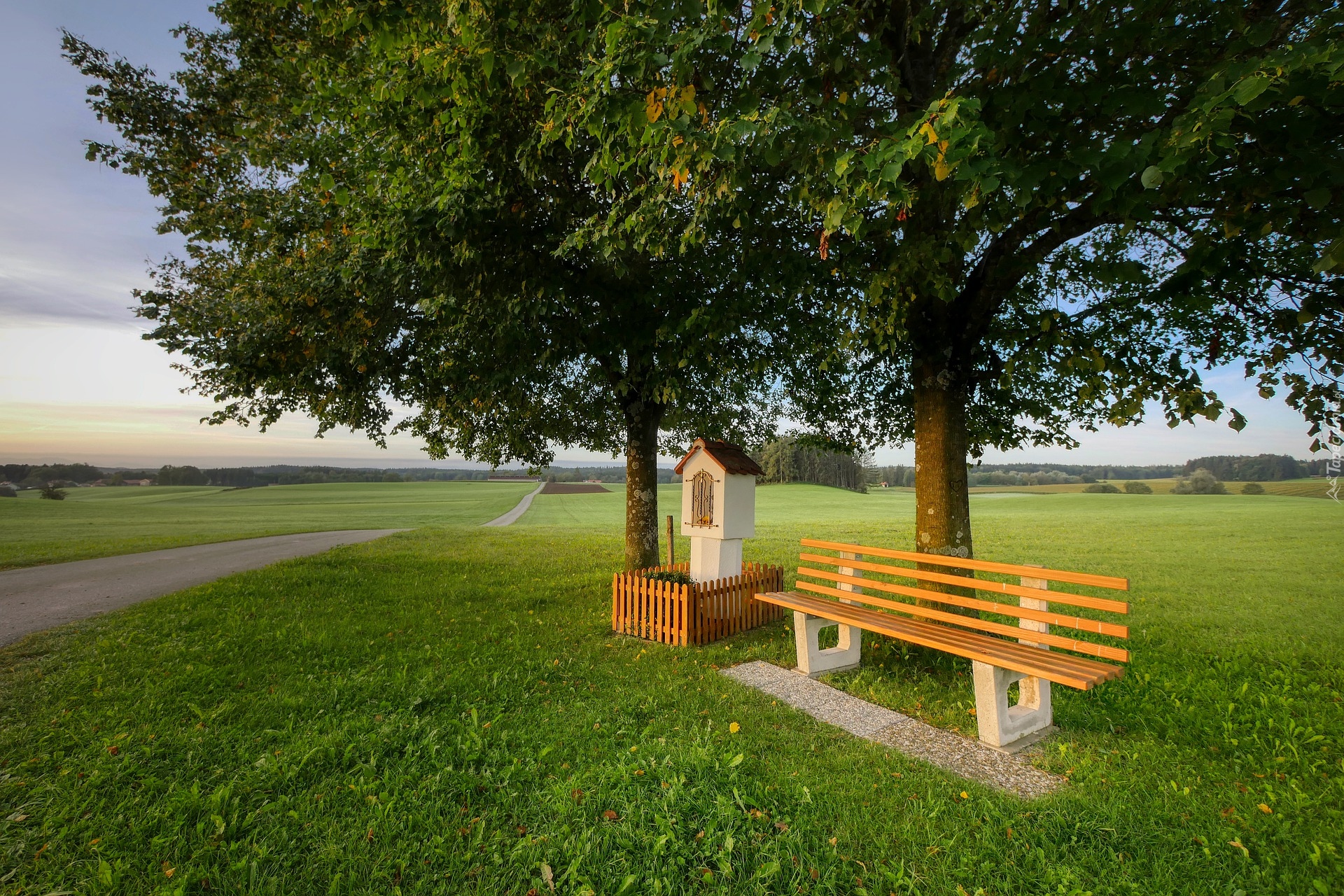 Edytor tapety: Ławka i kapliczka pod drzewami przy polnej drodze