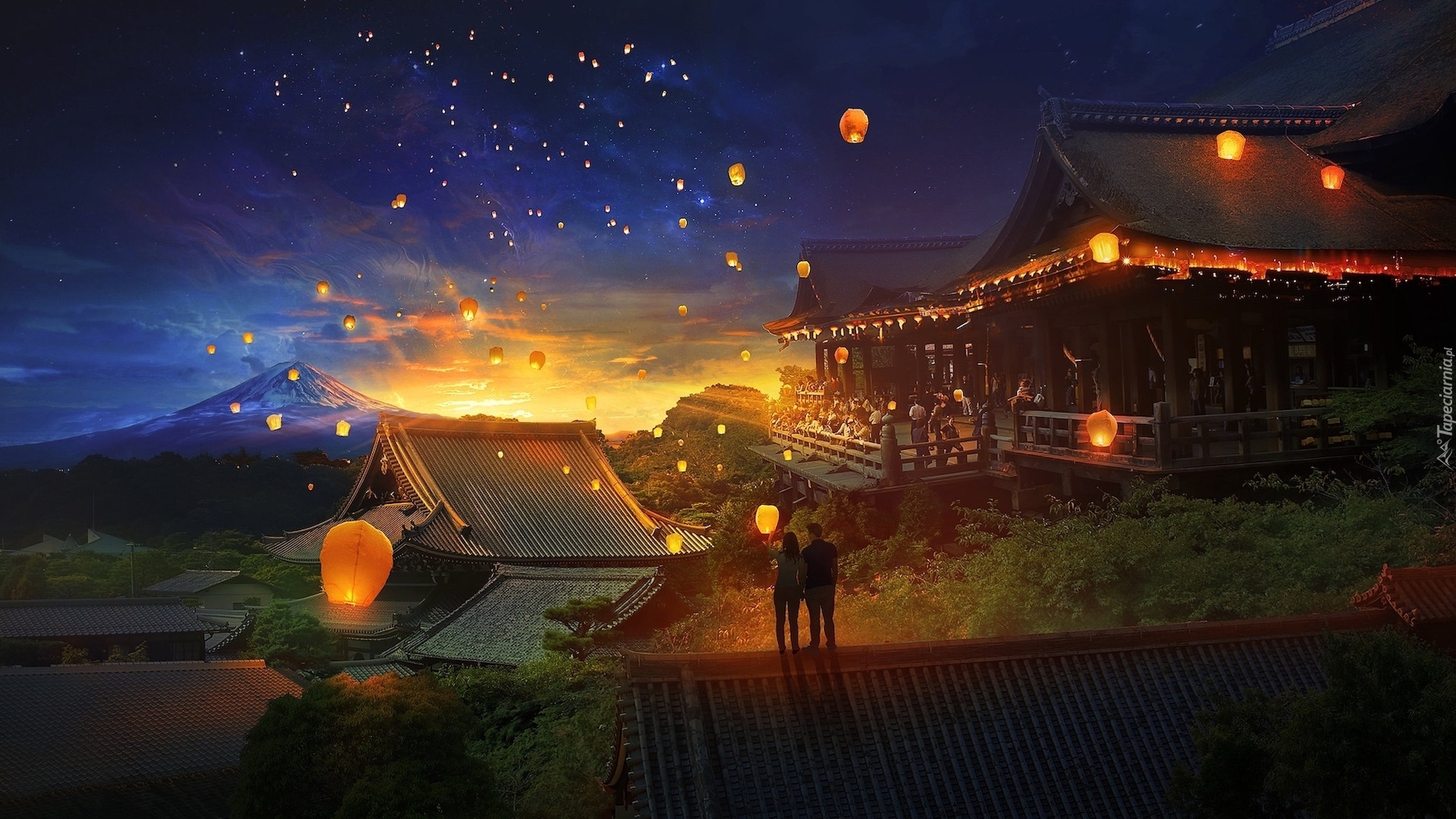 Edytor tapety: Lampiony nad domami na nocnym niebie