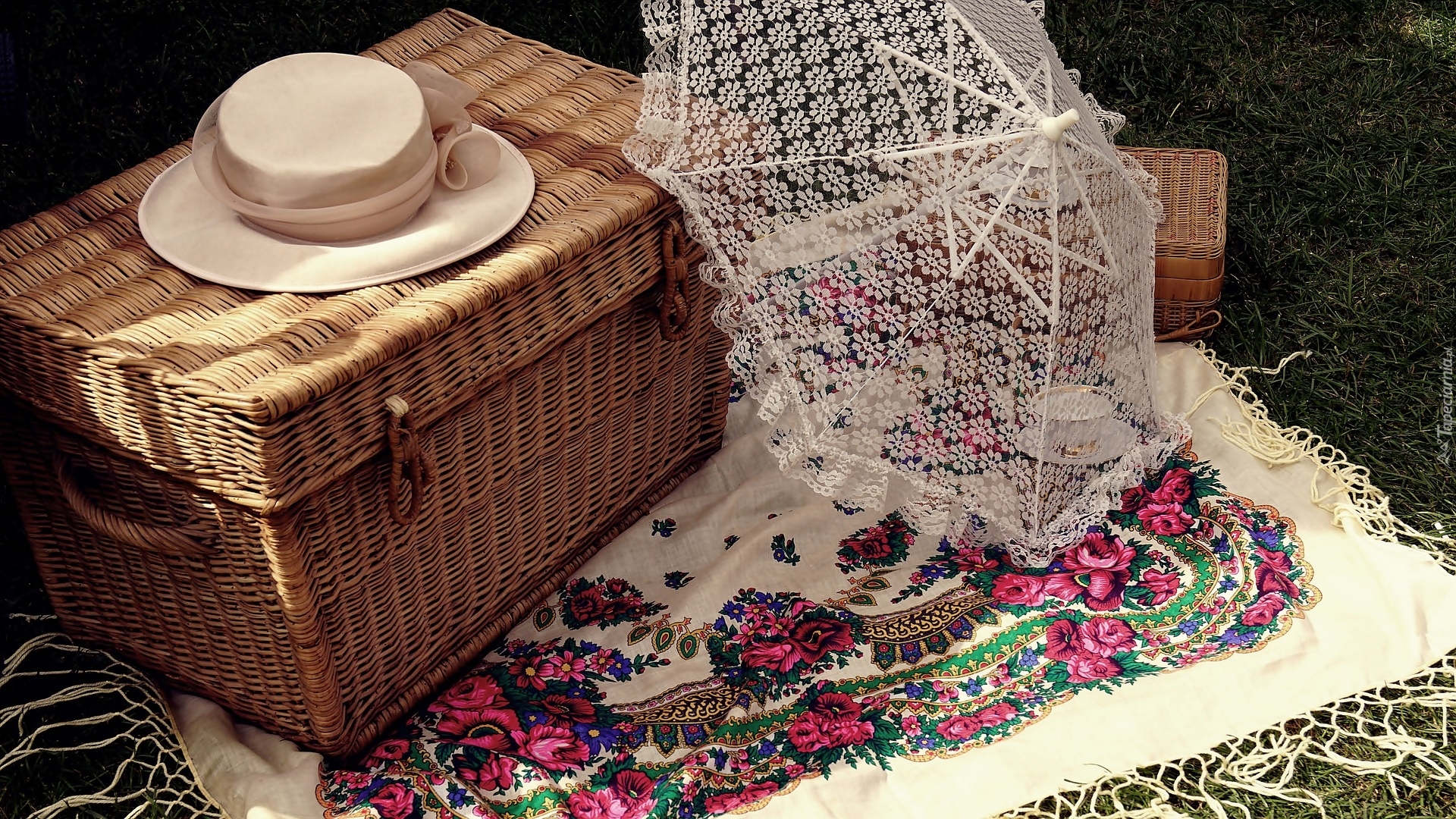 Edytor tapety: Koronkowa parasolka obok kapelusza na wiklinowej skrzyni