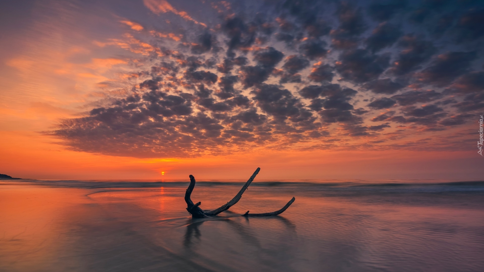 Edytor tapety: Suchy konar na nadmorskiej plaży o zachodzie słońca