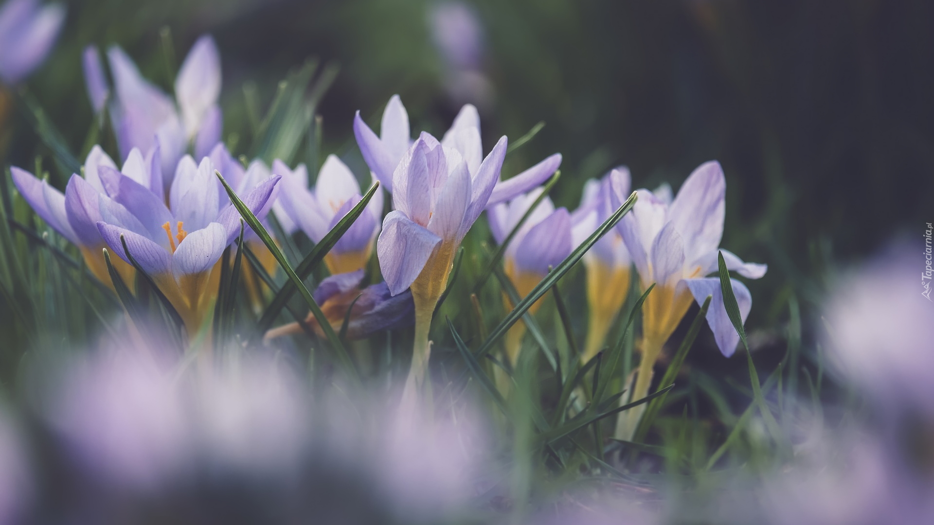 Edytor tapety: Kępka kwitnących krokusów jasnofioletowych