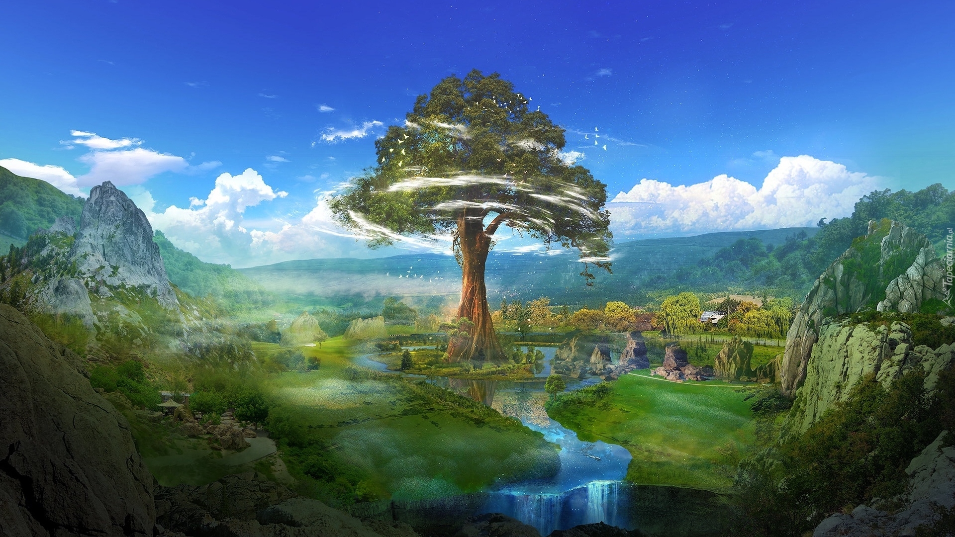 Edytor tapety: Wysokie drzewo nad rzeką w grafice