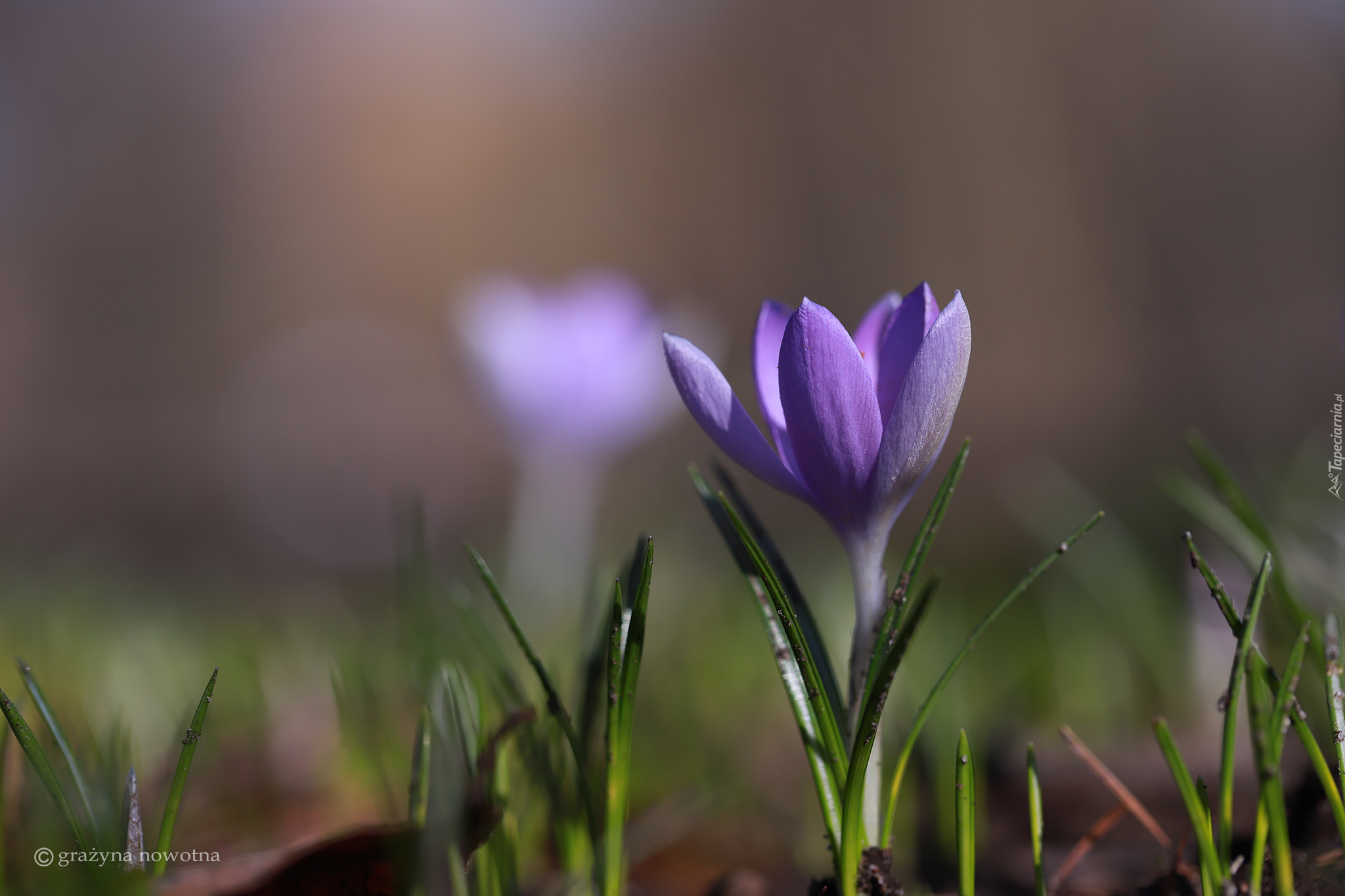 Edytor tapety: Rozwinięty fioletowy krokus w trawie