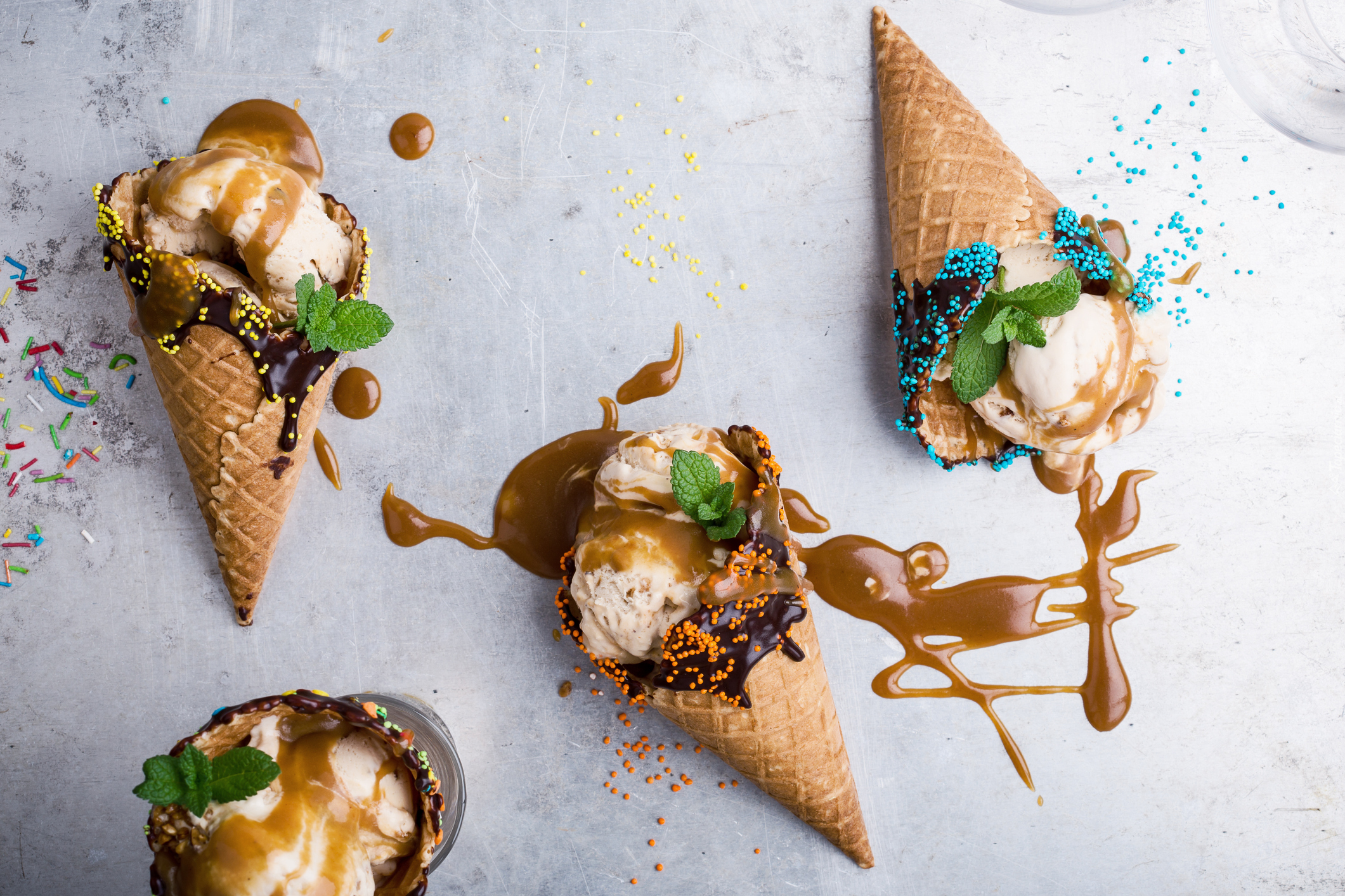 Edytor tapety: Lody w rożkach w polewie karmelowej