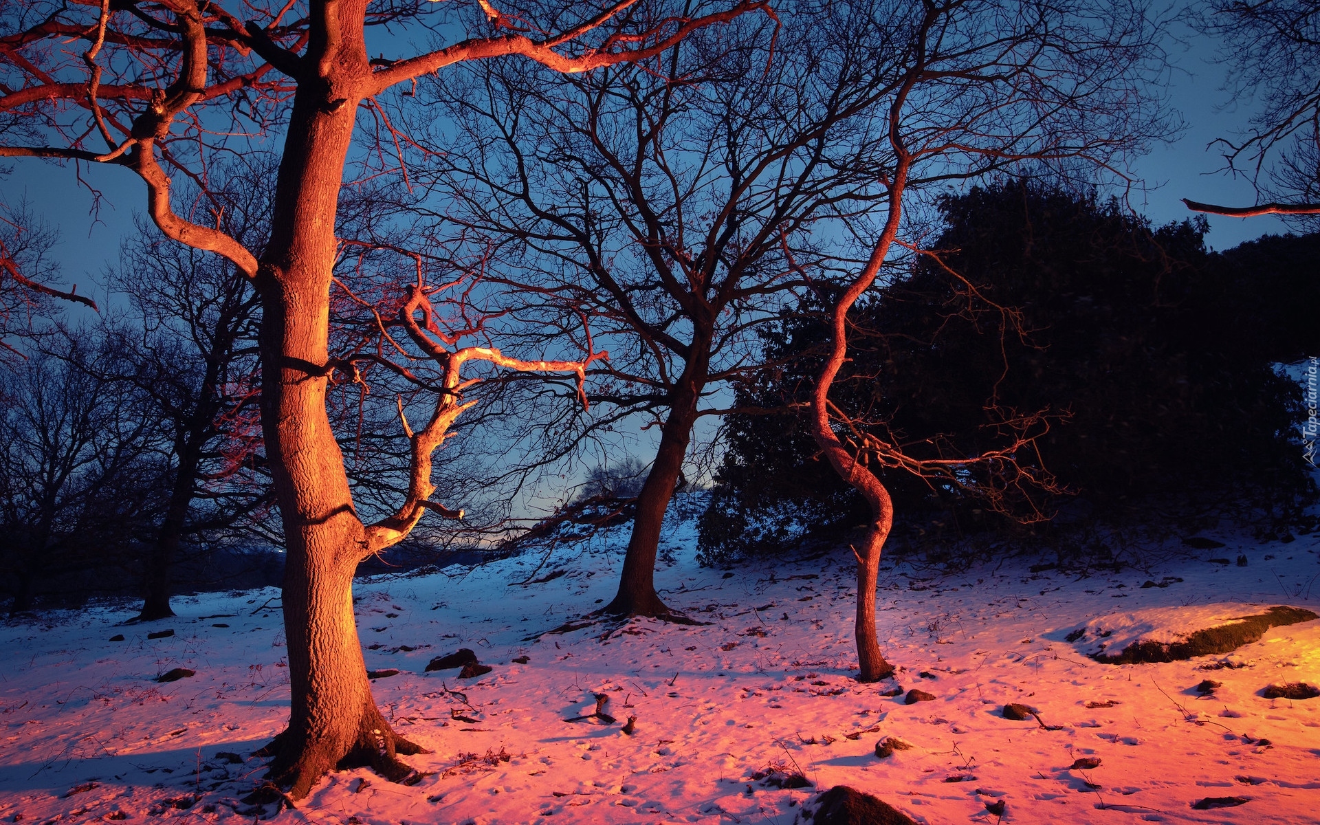 Edytor tapety: Rozświetlone słońcem bezlistne drzewa w śniegu