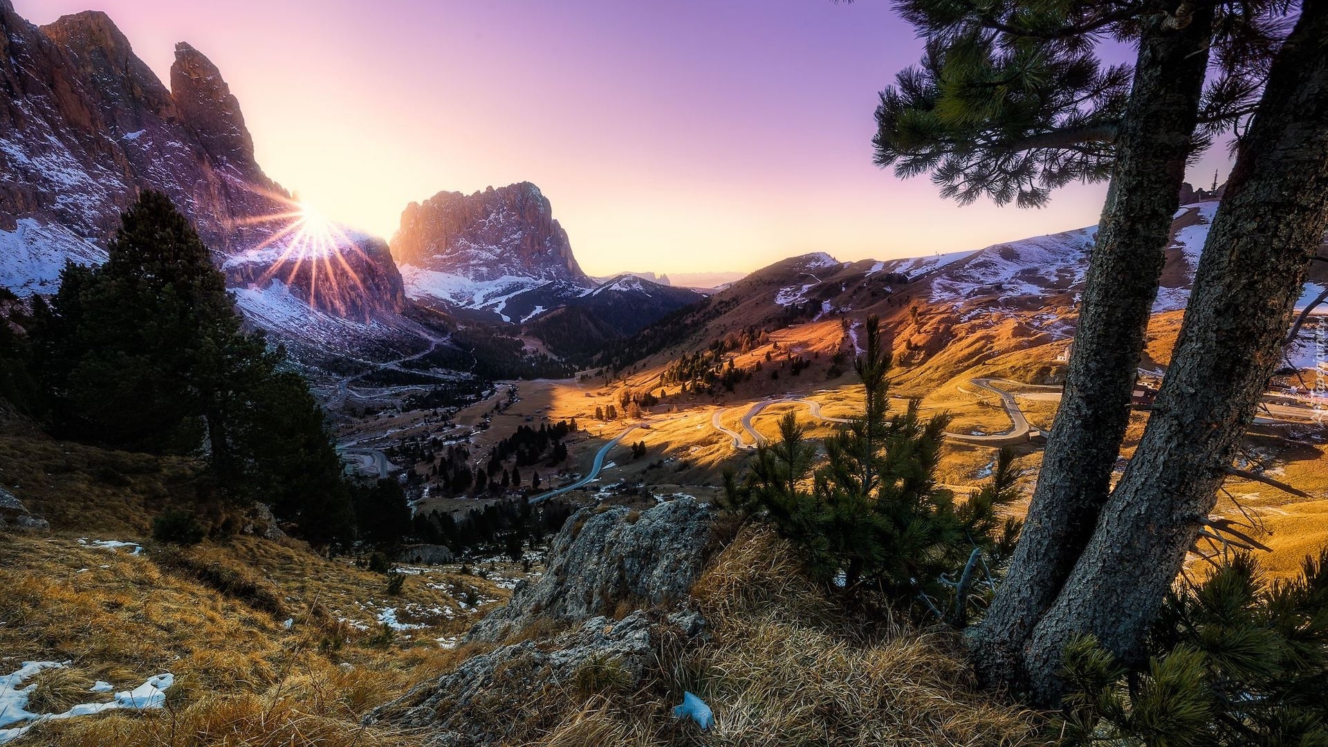 Edytor tapety: Kręta droga w górskiej dolinie w słonecznym blasku