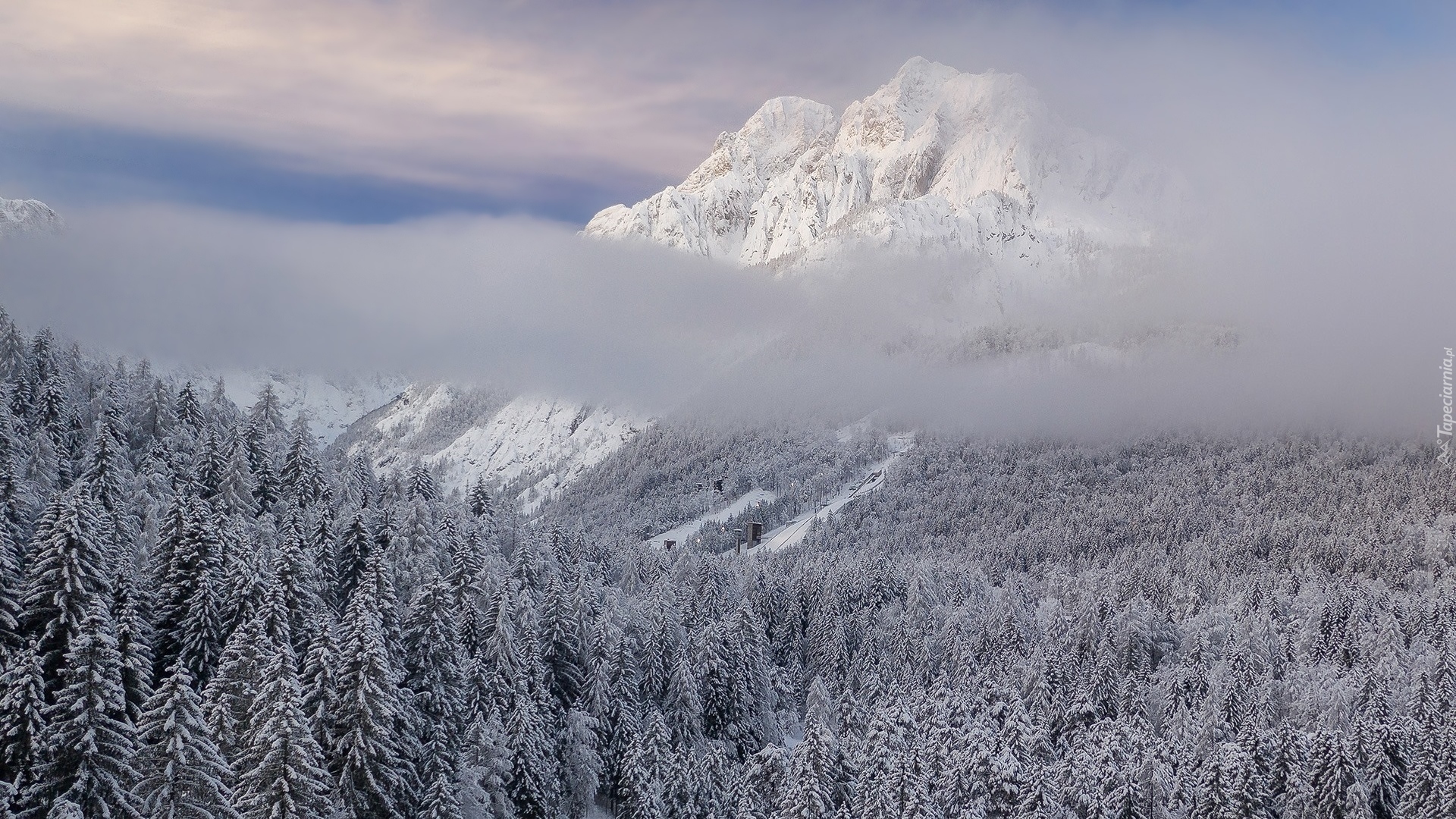 Edytor tapety: Mgła nad ośnieżonym lasem na tle gór