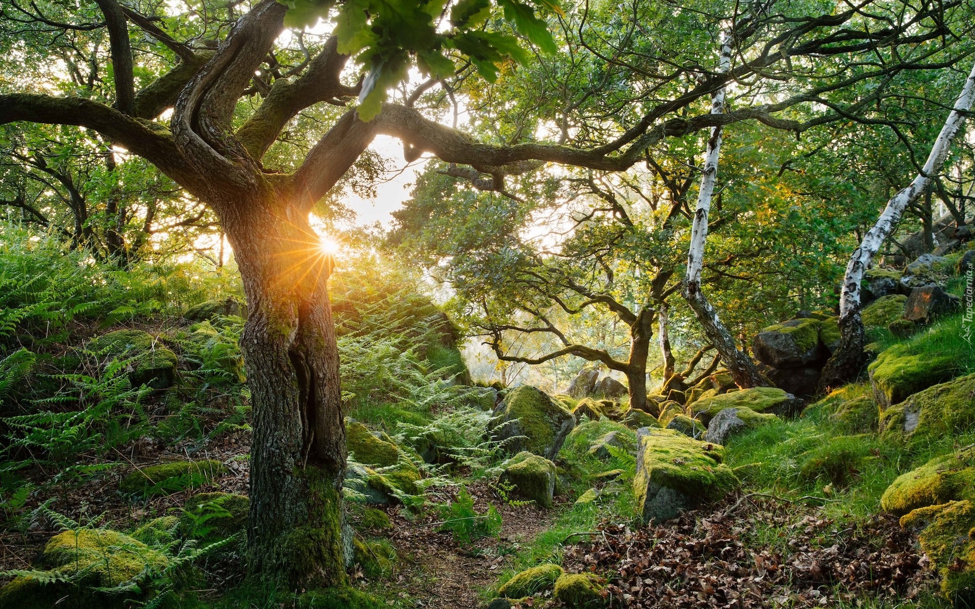 Edytor tapety: Omszałe kamienie pod drzewami w lesie