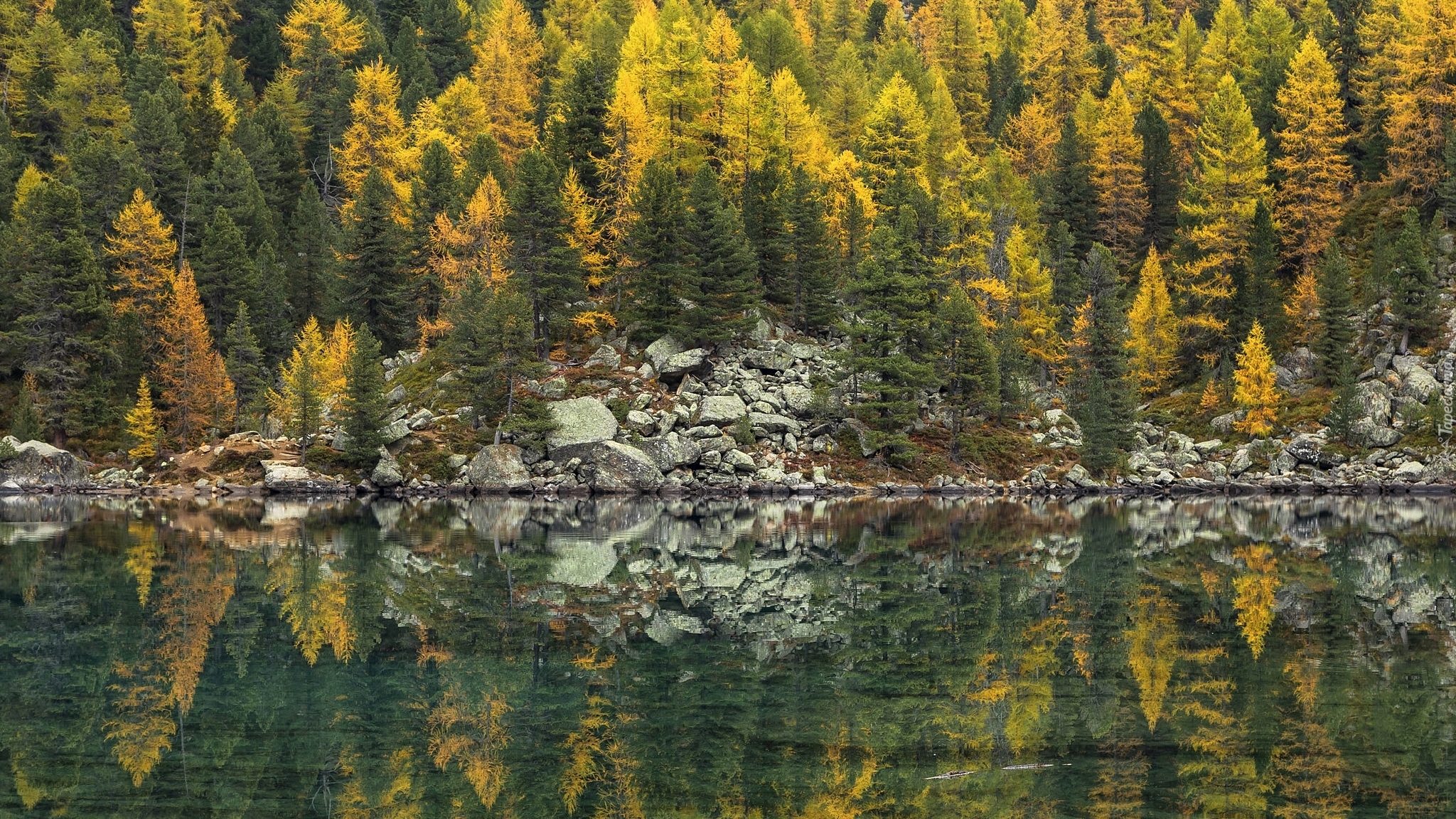 Edytor tapety: Żółte i zielone drzewa nad rzeką