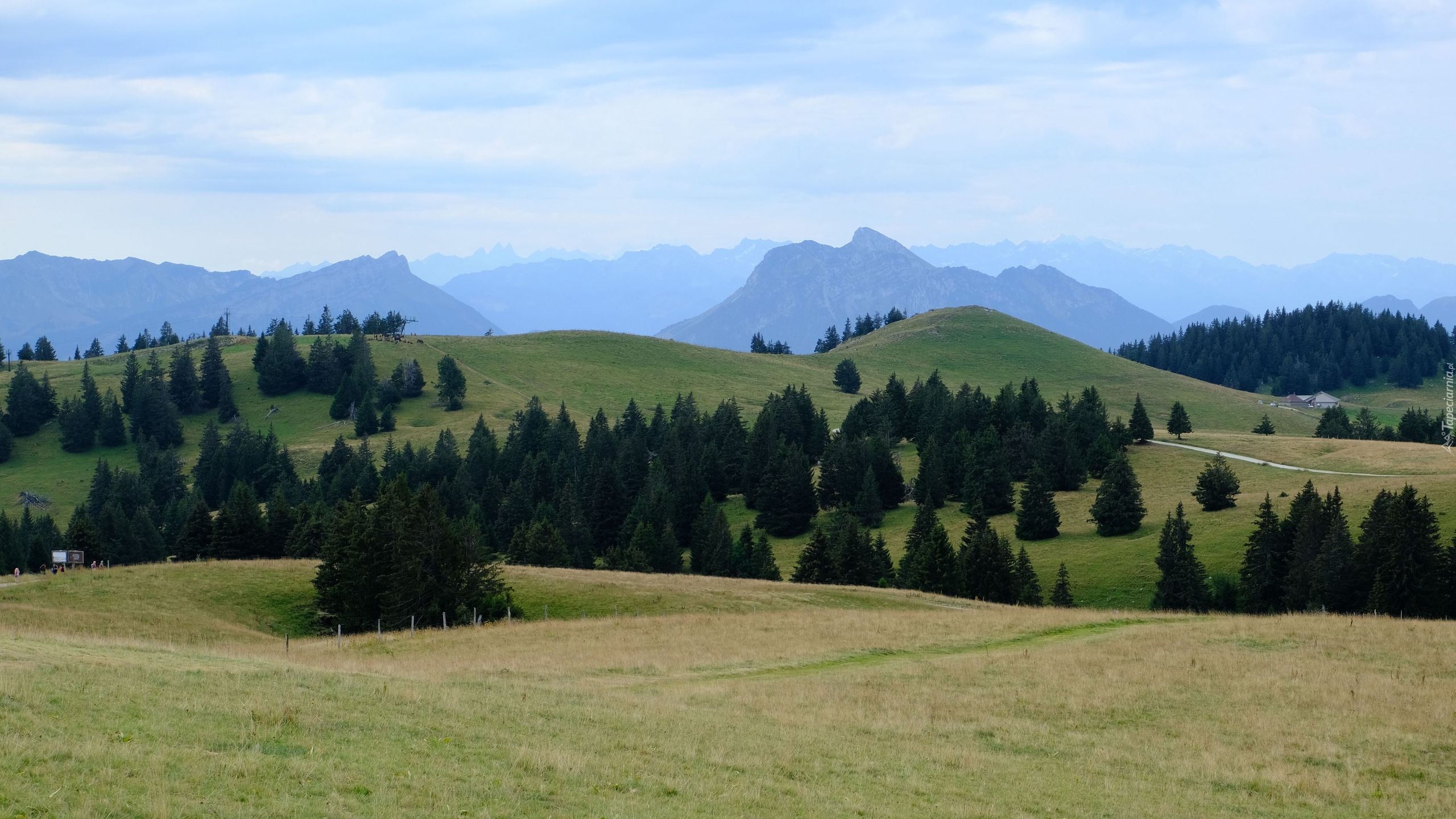 Edytor tapety: Drzewa na zielonych wzgórzach na tle zamglonych gór