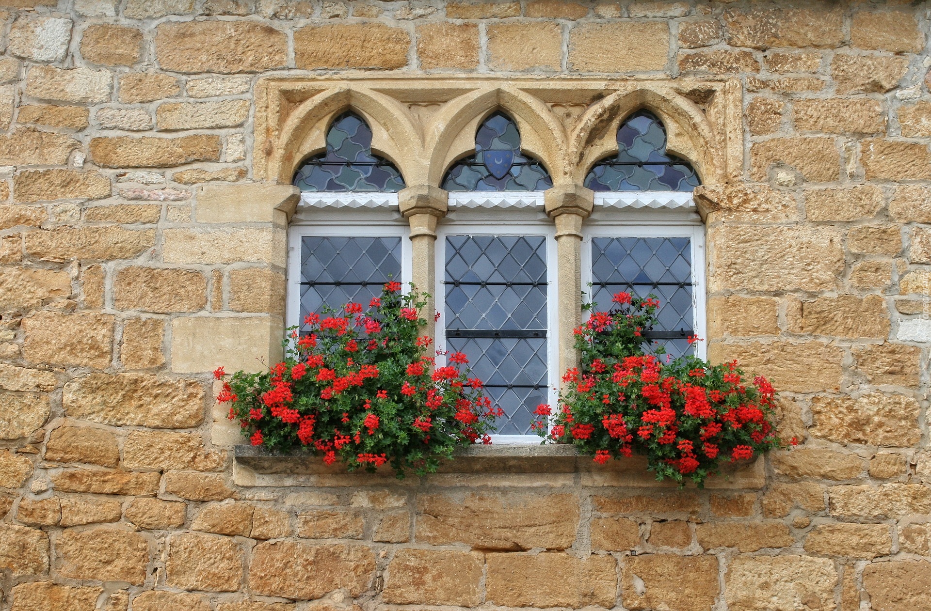 Edytor tapety: Pelargonie na zewnętrznym parapecie okna