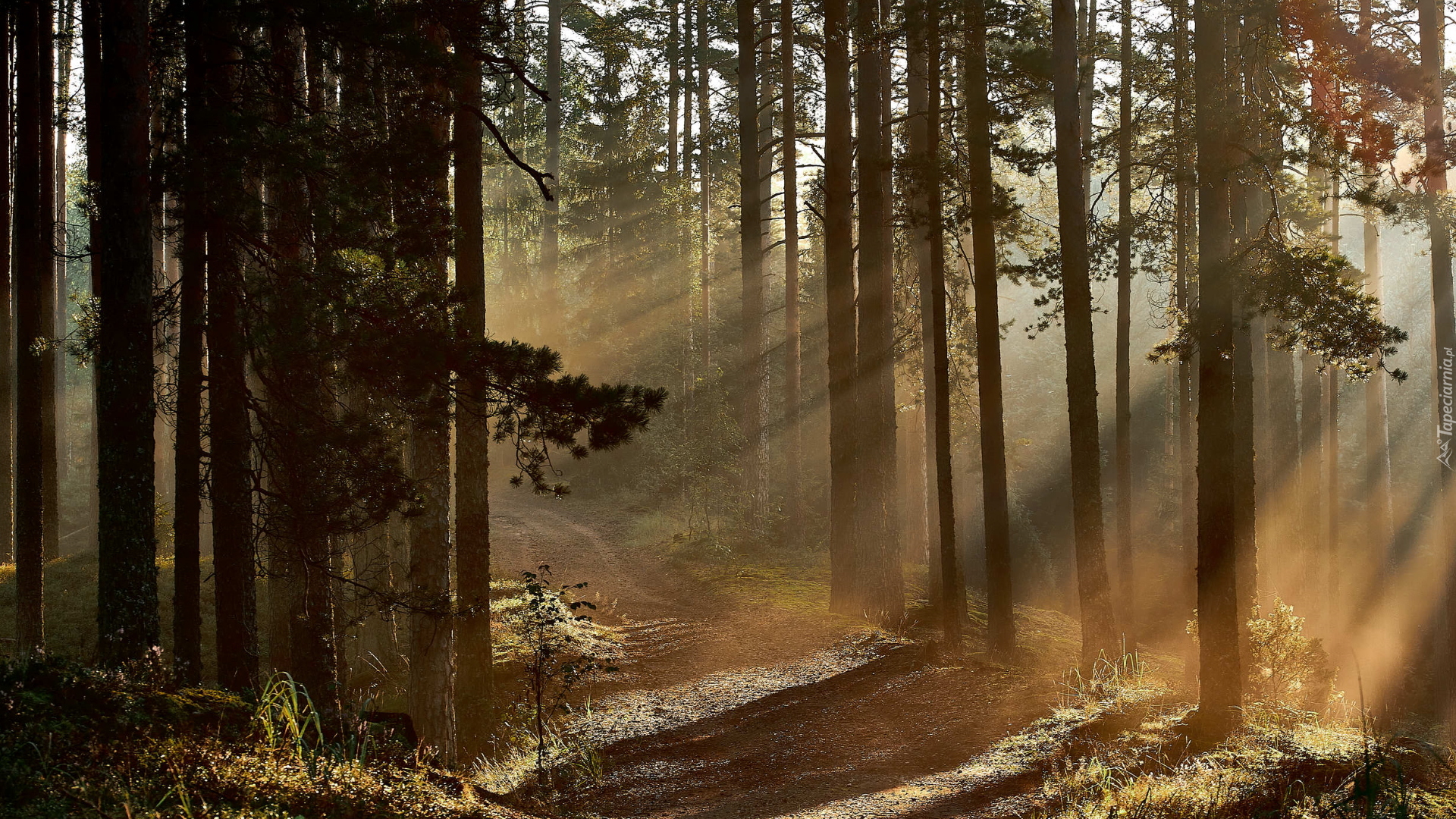 Edytor tapety: Droga w sosnowym lesie w słonecznych promieniach