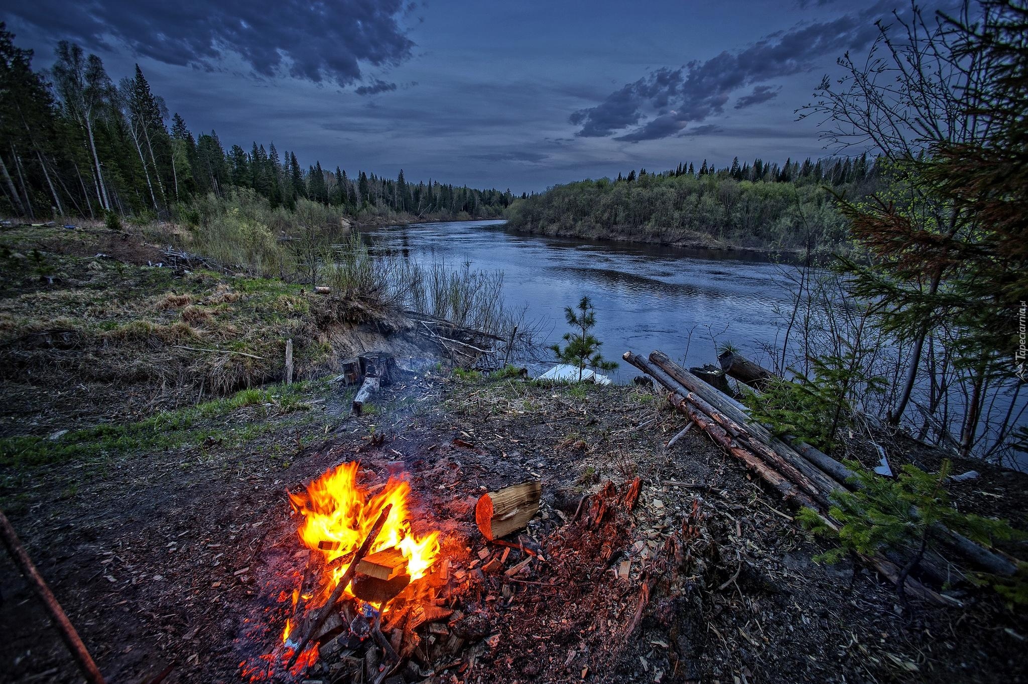 Edytor tapety: Ognisko nad rzeką o zachodzie słońca