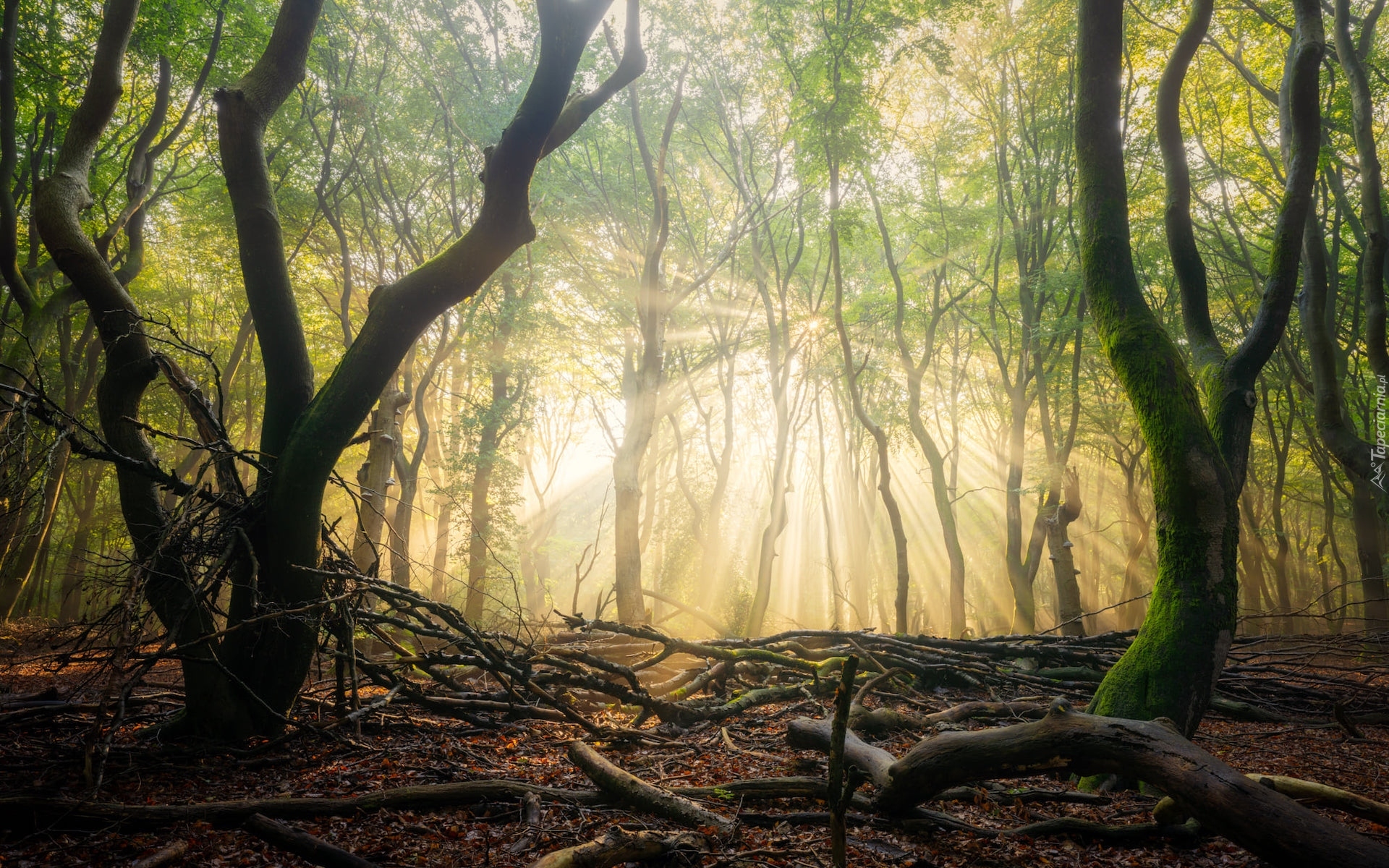 Edytor tapety: Omszałe drzewa i powalone konary w lesie