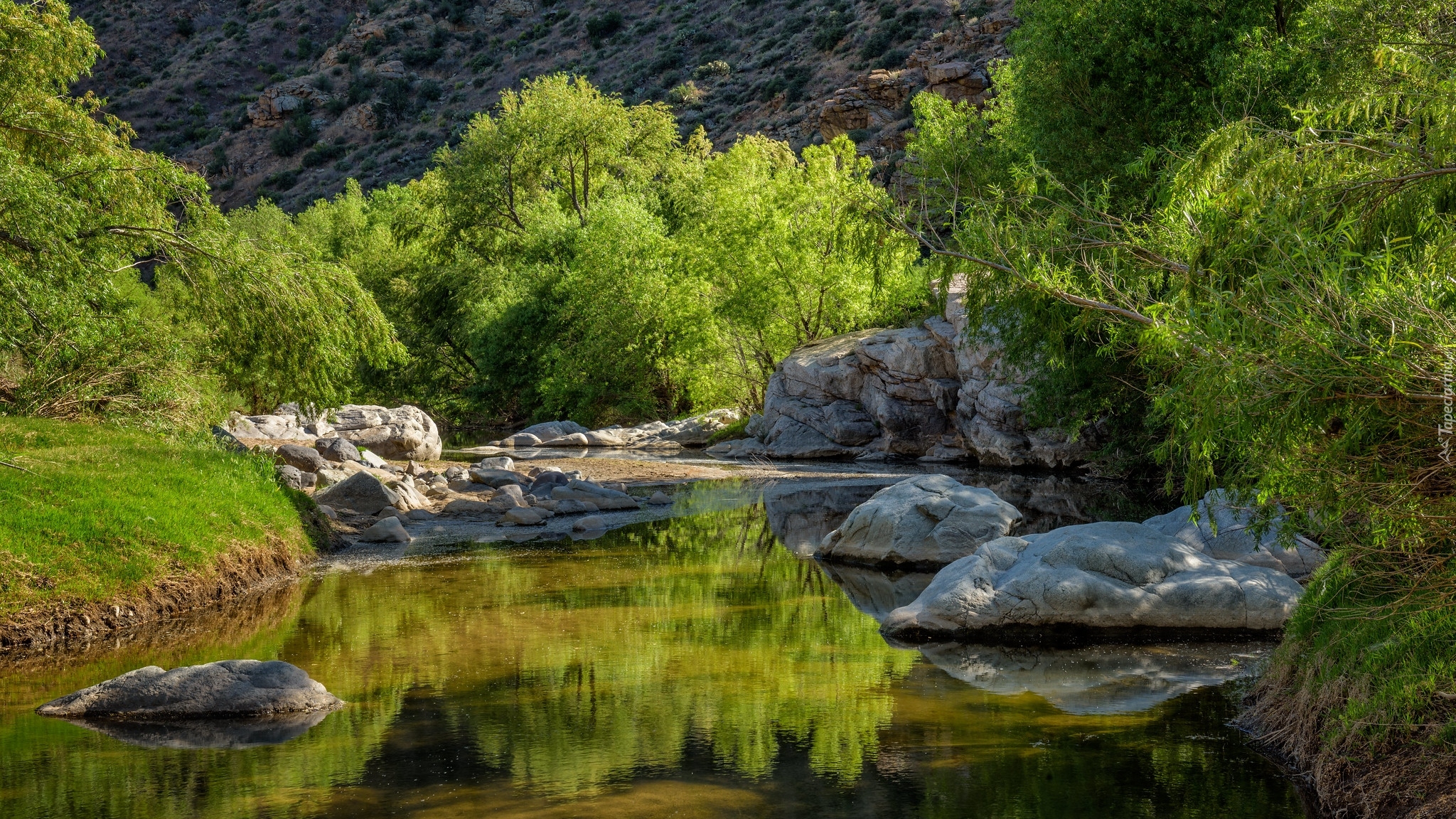 Edytor tapety: Zielone drzewa i skały na brzegach górskiej rzeki