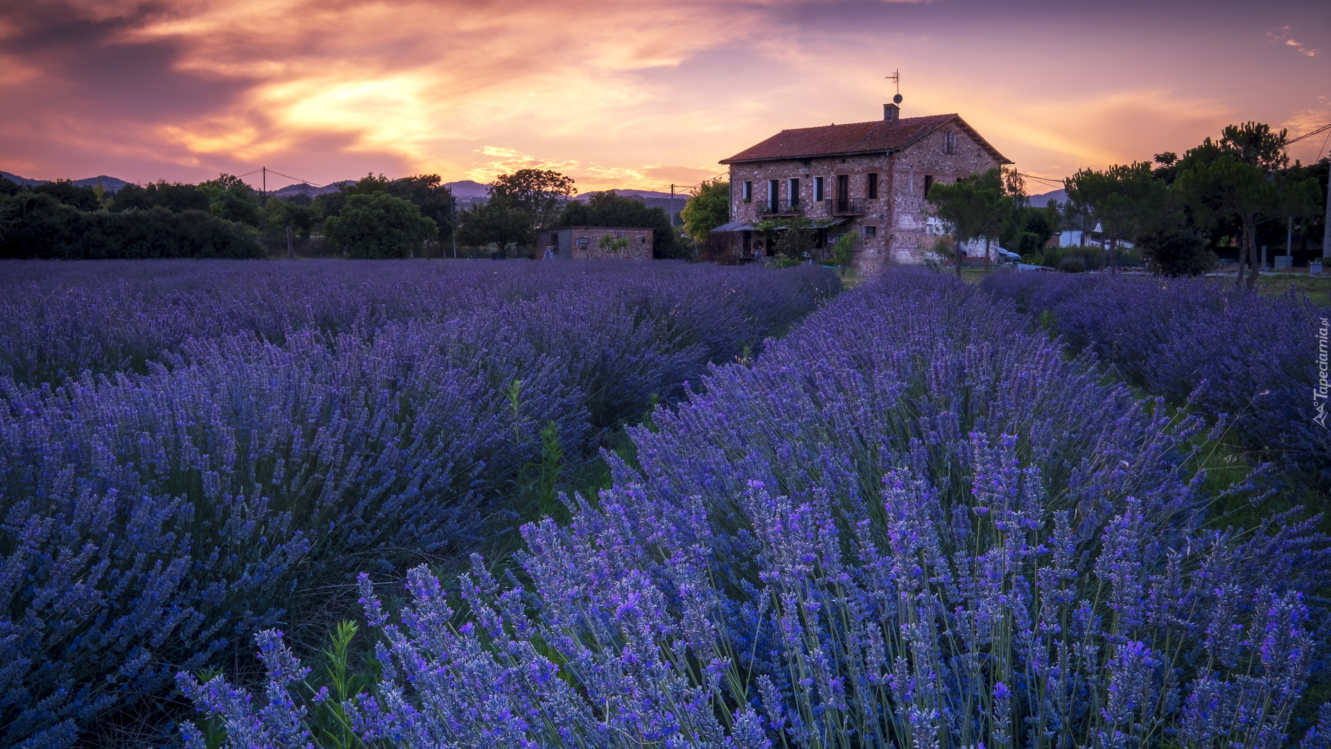 Edytor tapety: Dom na polu lawendy o poranku