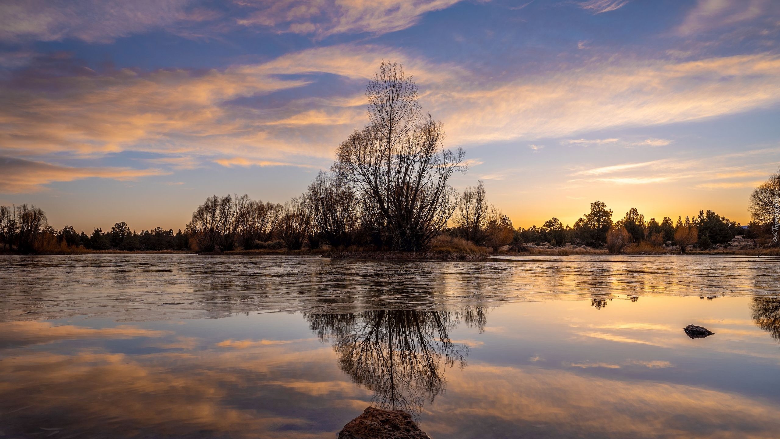 Edytor tapety: Bezlistne drzewa i krzewy nad jeziorem
