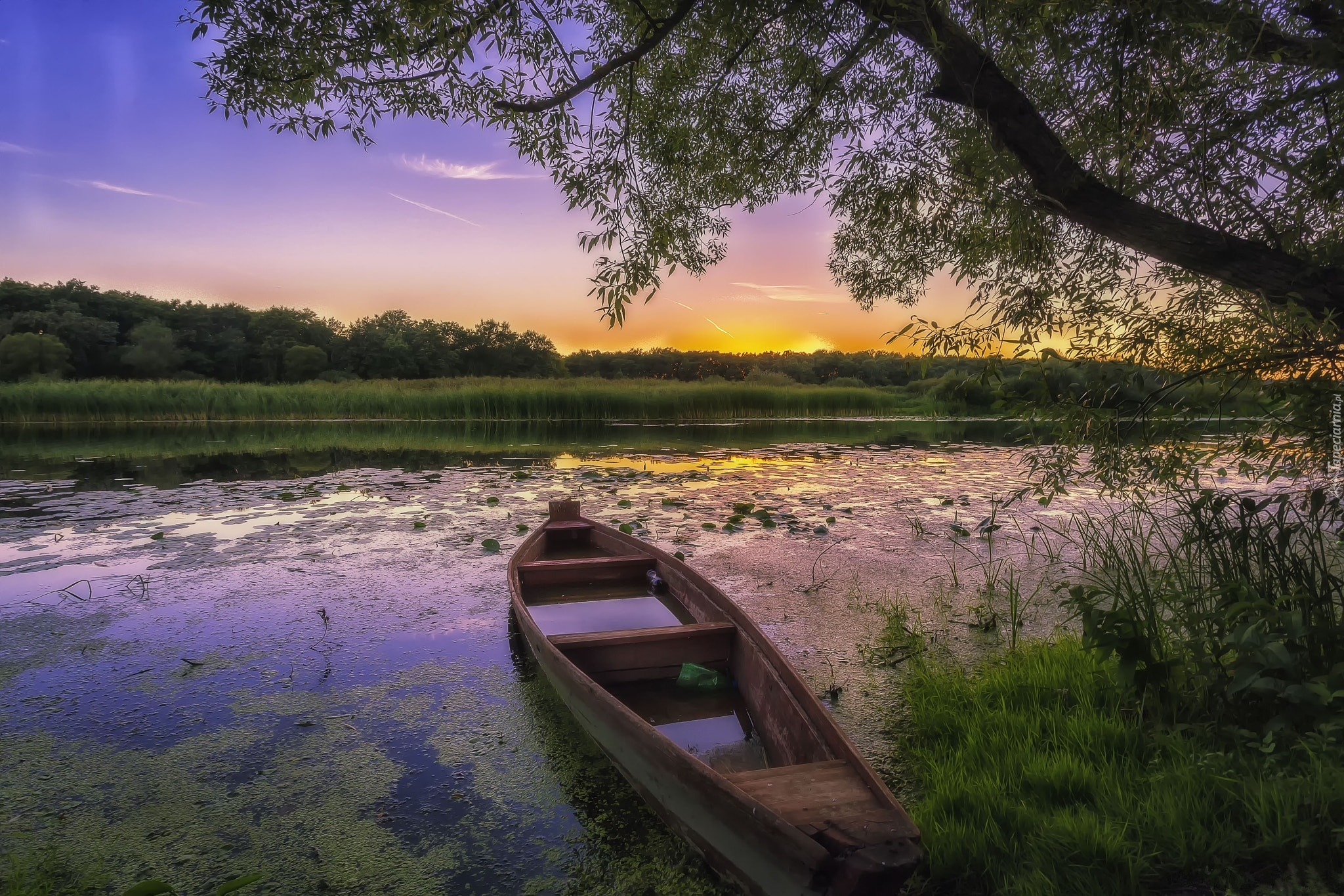 Edytor tapety: Łódka na brzegu stawu pod drzewem