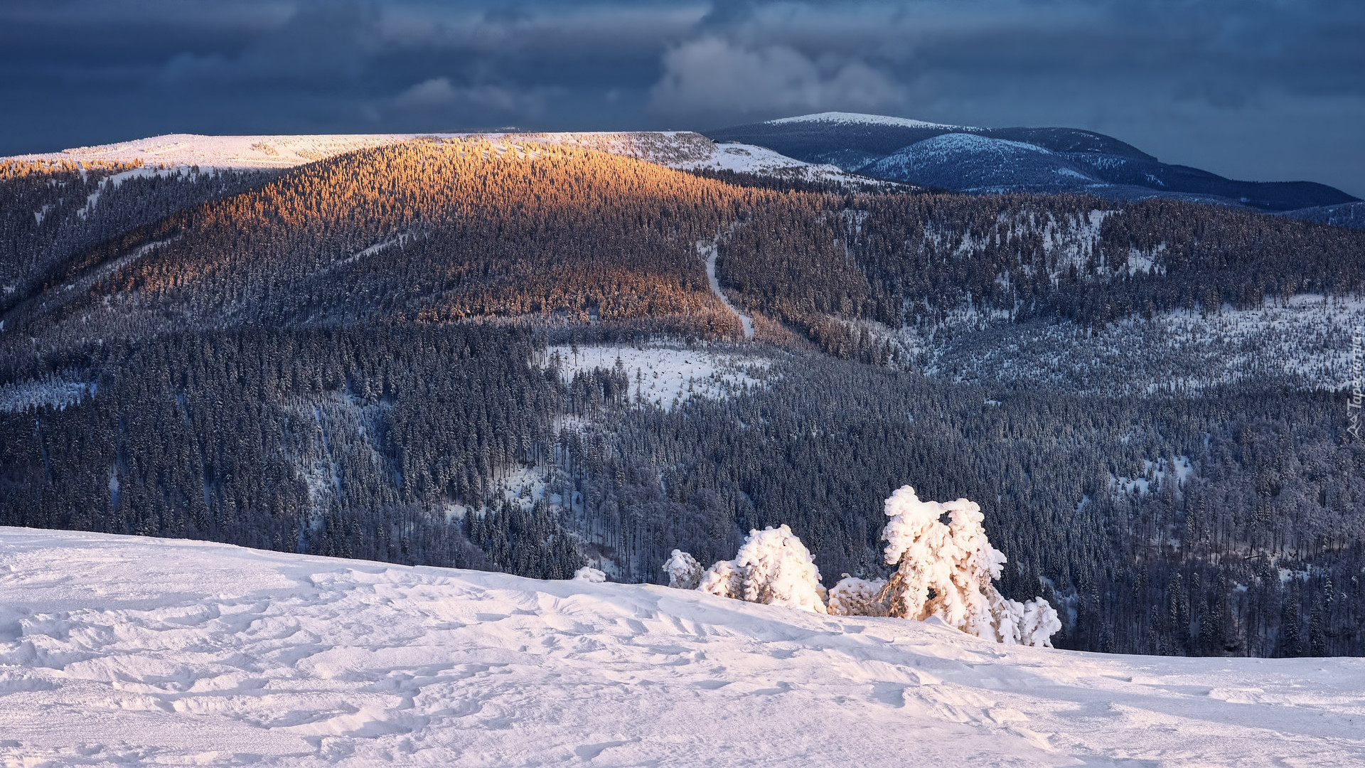 Edytor tapety: Chmury nad górami i lasami zimową porą