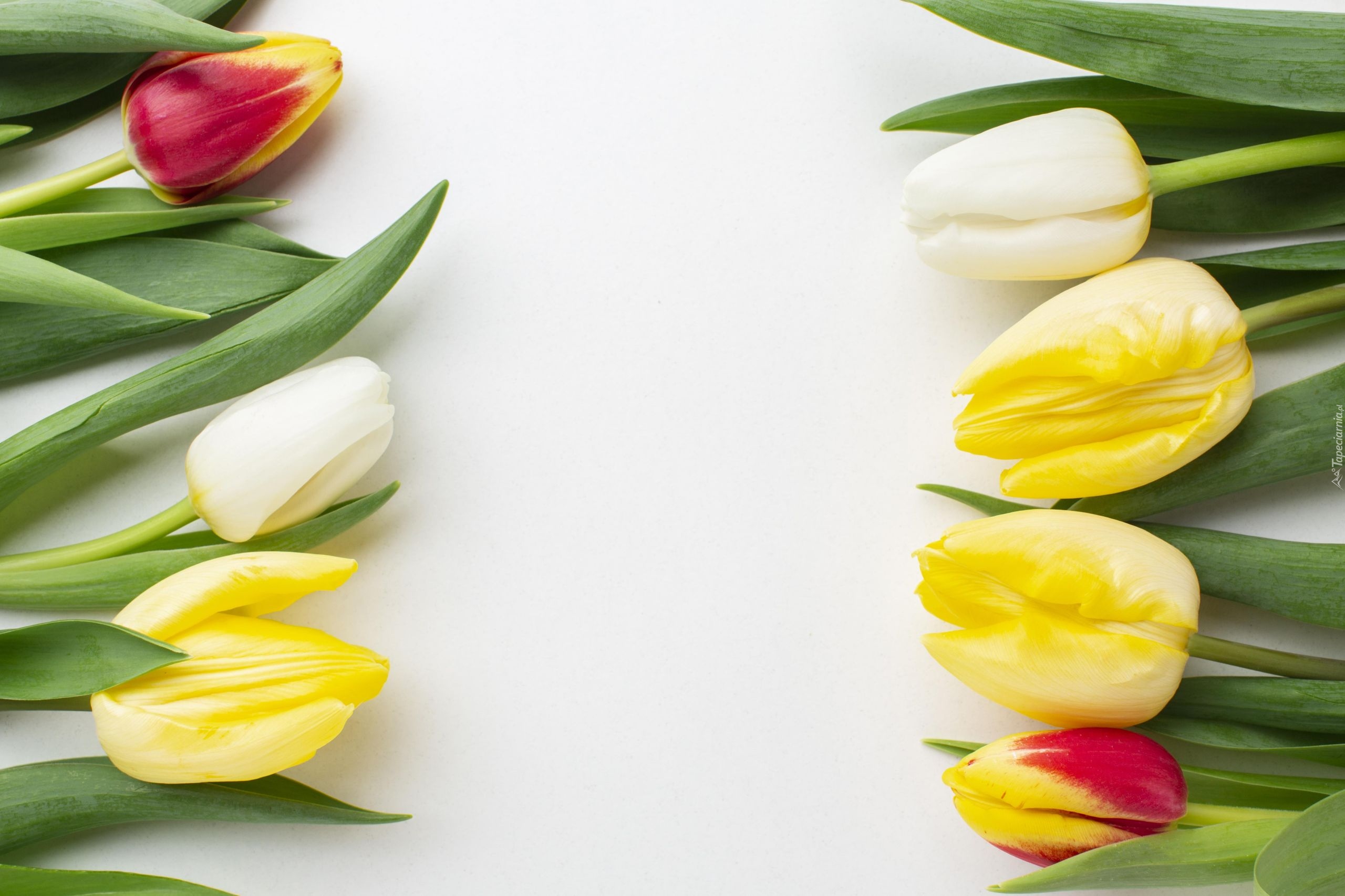 Edytor tapety: Kolorowe tulipany ułożone na białym tle