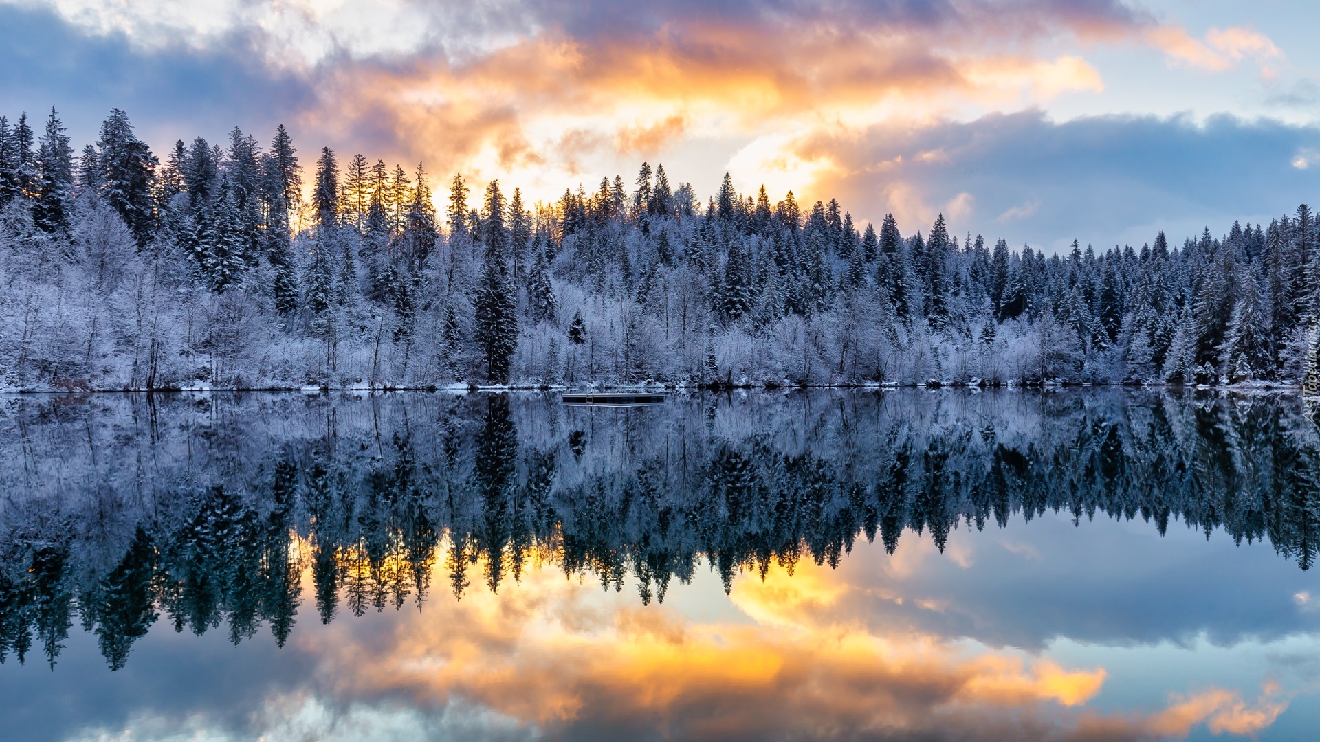 Edytor tapety: Ośnieżony las nad jeziorem o wschodzie słońca