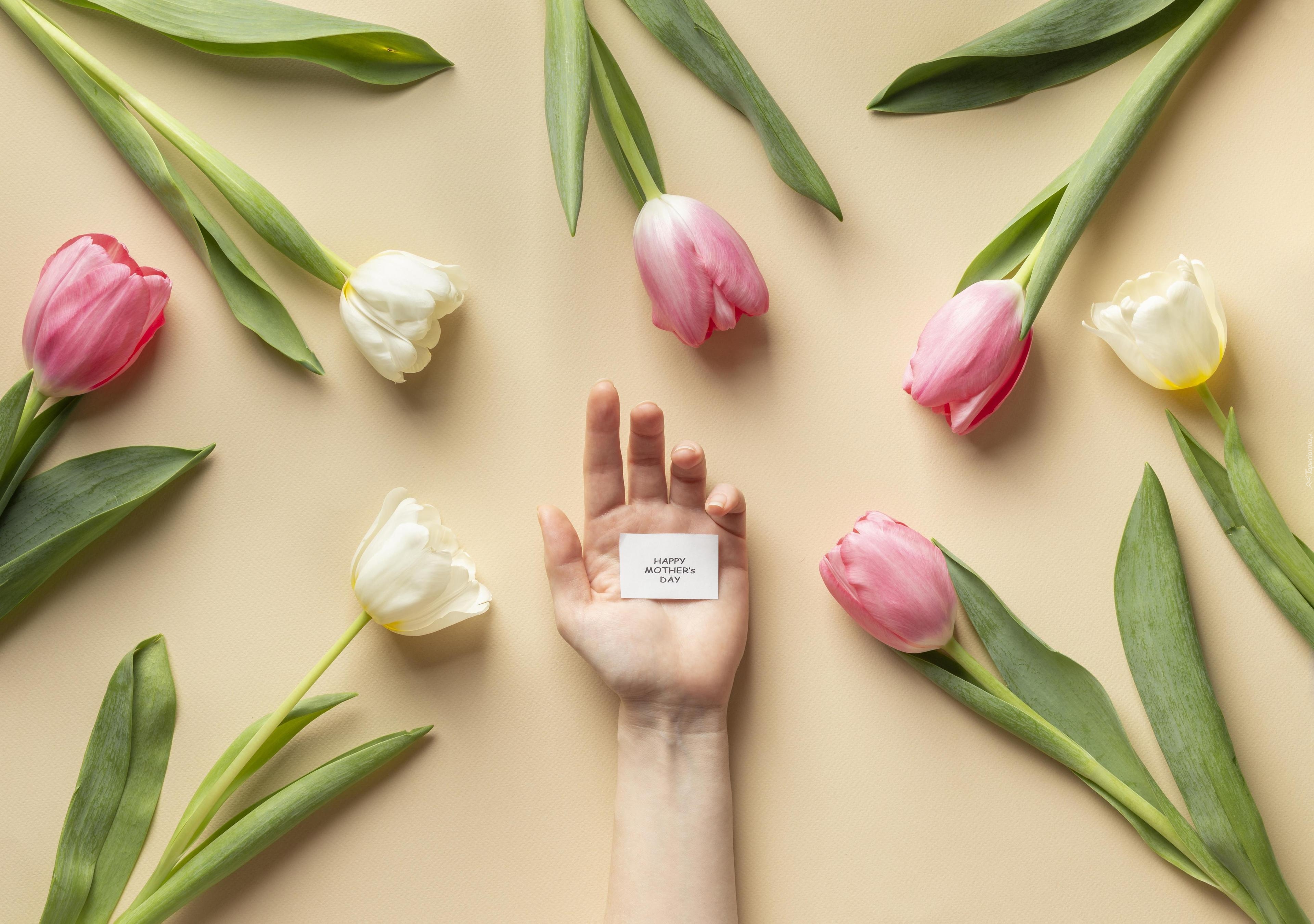 Edytor tapety: Tulipany obok dłoni z życzeniami dla mamy