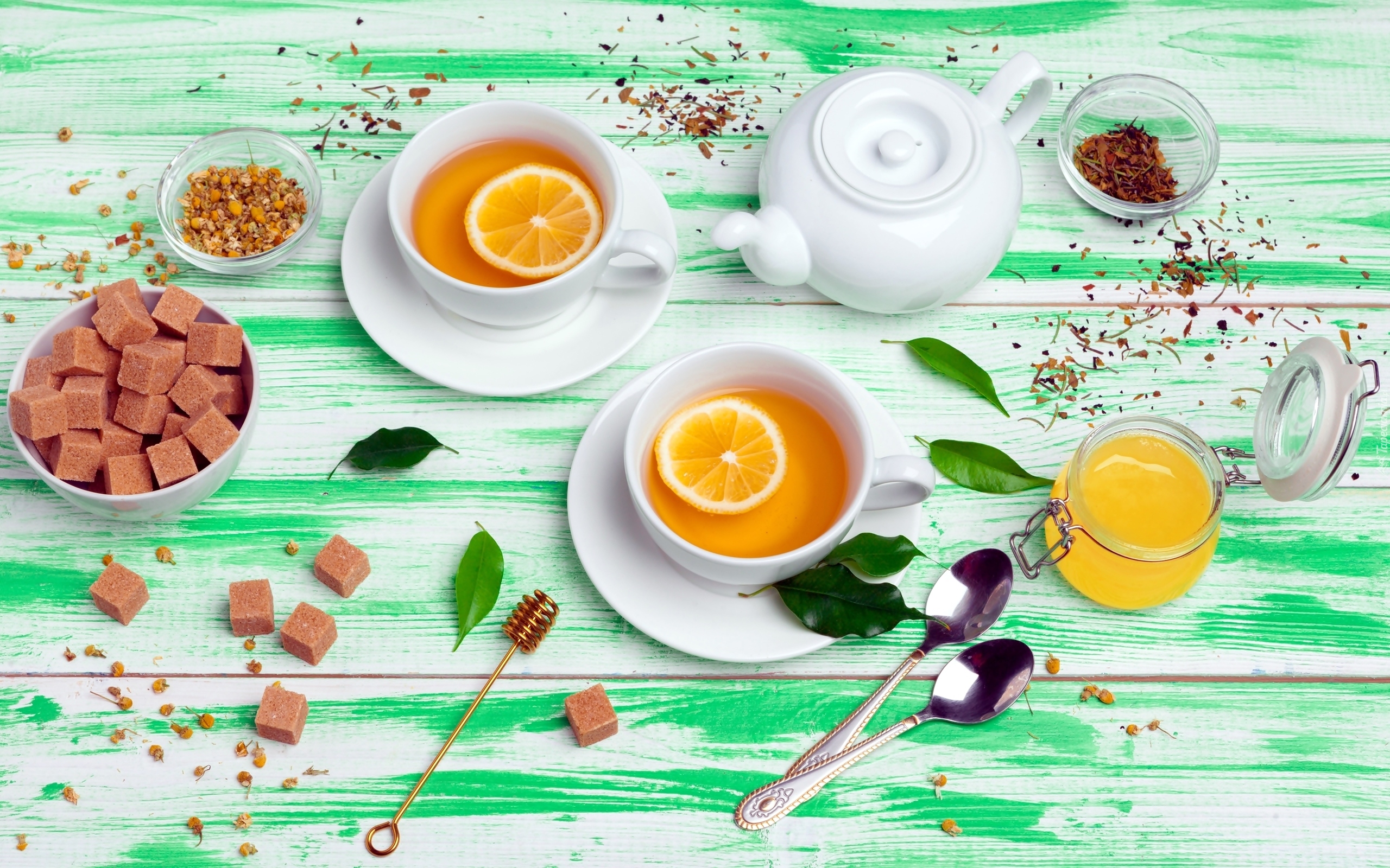 Edytor tapety: Herbata w filiżankach obok słoika miodu