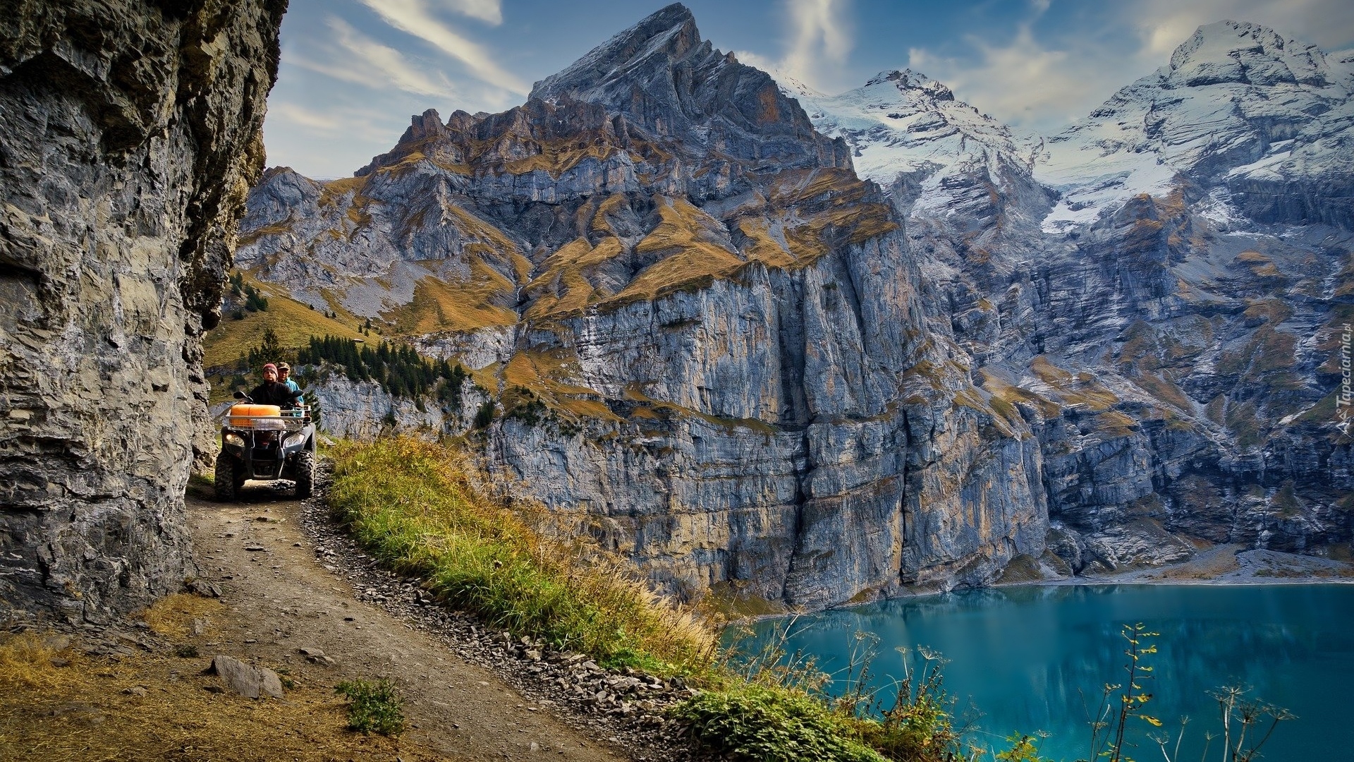 Edytor tapety: Mężczyźni na quadzie nad górskim jeziorem