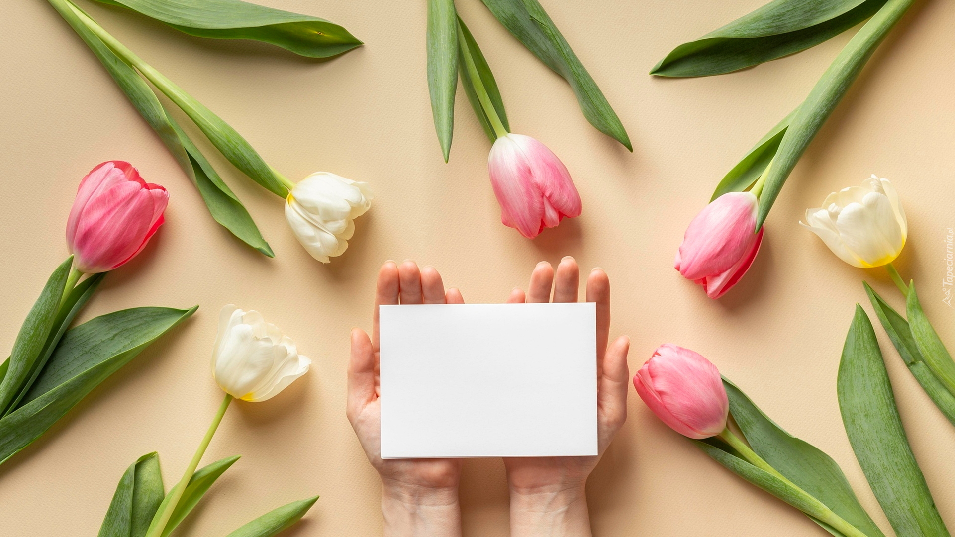 Edytor tapety: Kartka w dloniach pośród tulipanów