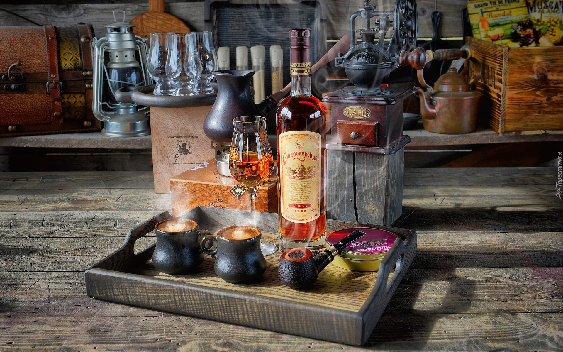 Edytor tapety: Butelka koniaku obok kawy na tacy