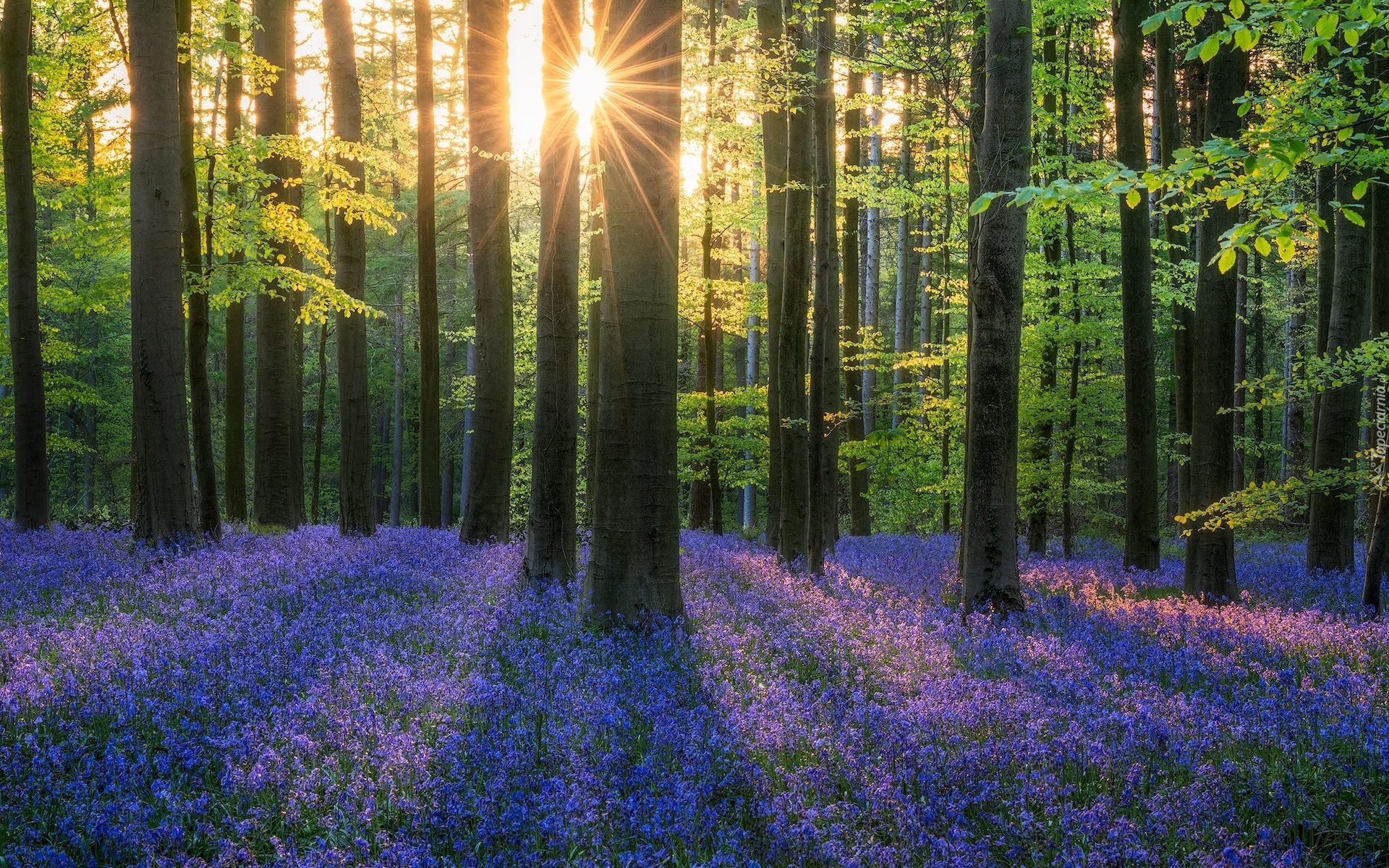 Edytor tapety: Hiacyntowce pod drzewami w słonecznym lesie Hallerbos
