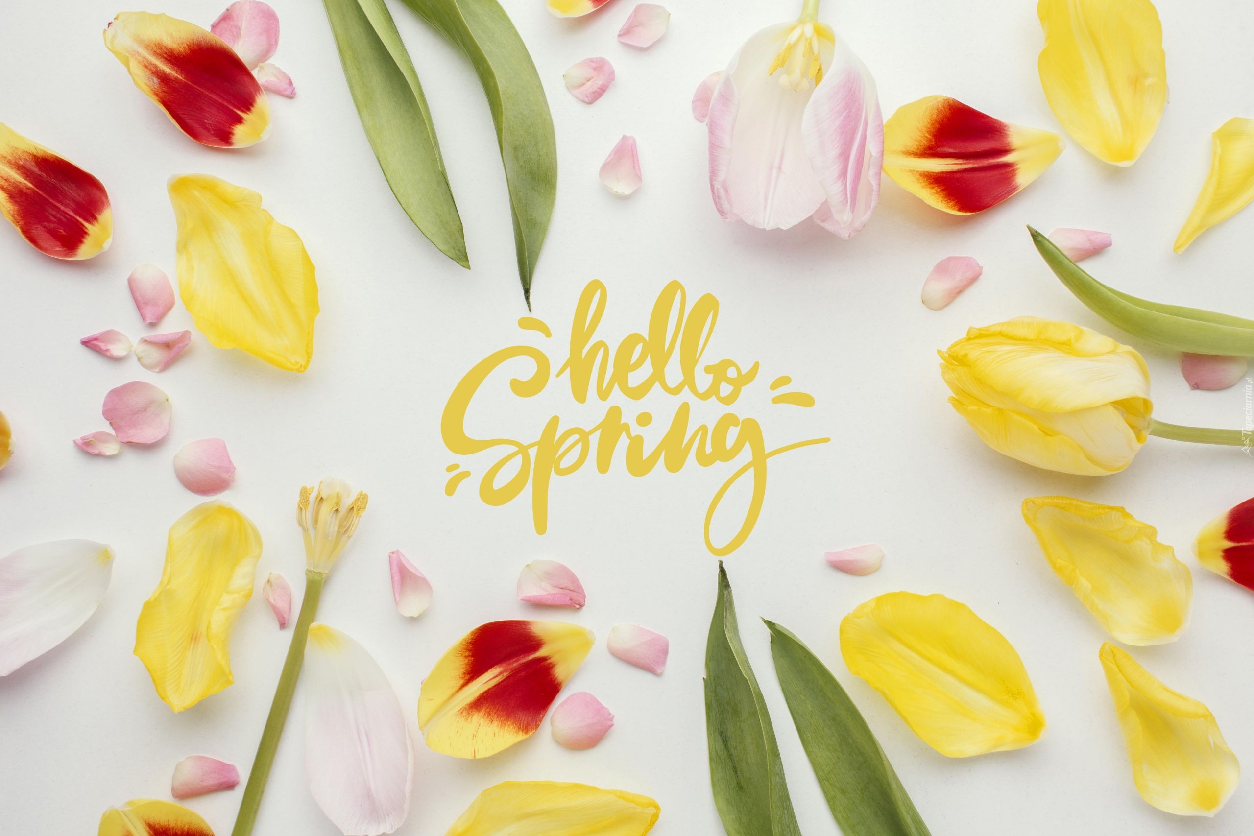 Edytor tapety: Napis Hello Spring pośród płatków tulipana