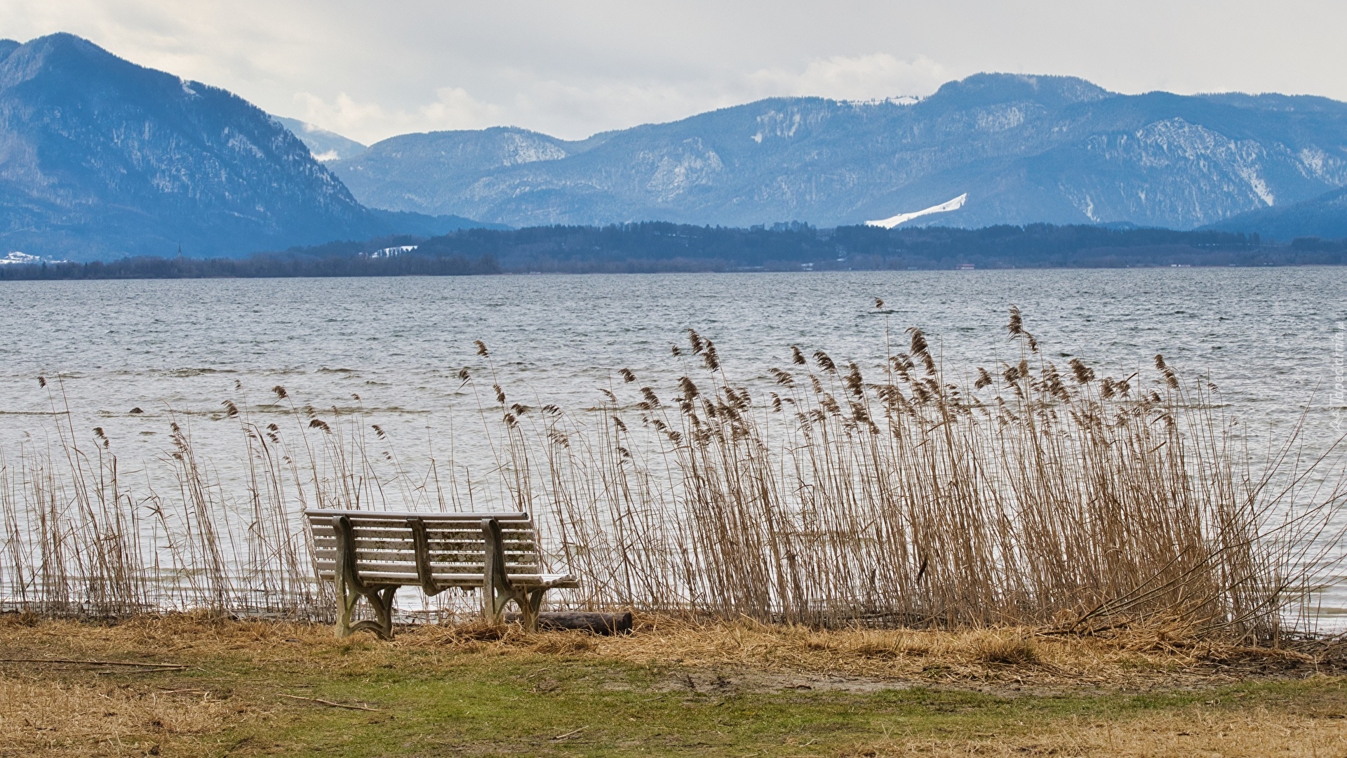 Edytor tapety: Ławka obok wysokiej trawy nad jeziorem