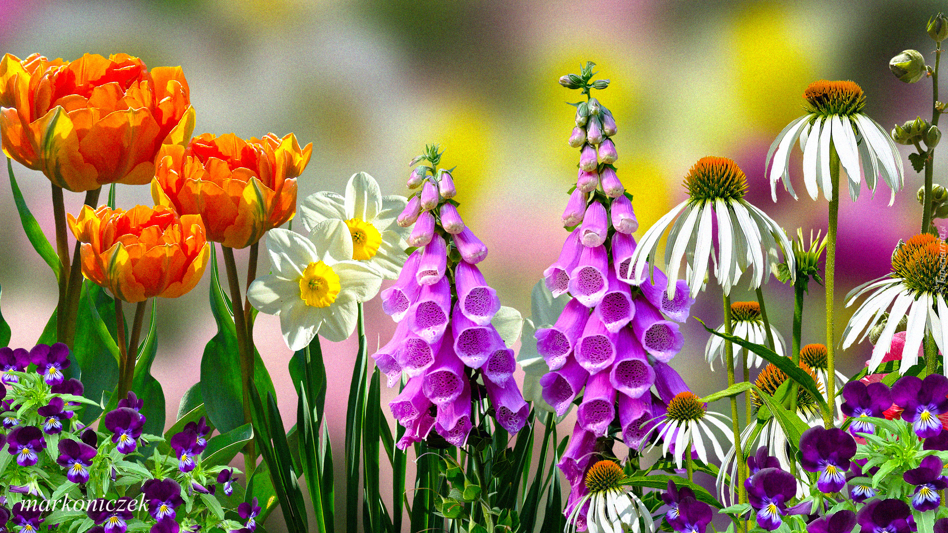 Edytor tapety: Naparstnice obok jeżówek i tulipanów w grafice