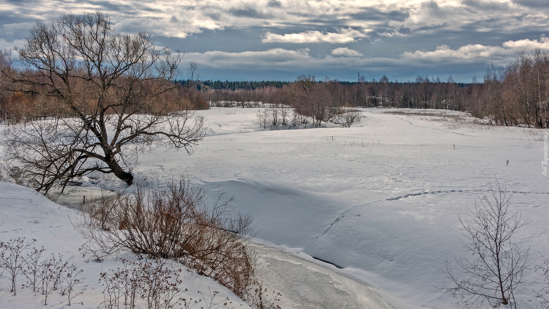 Edytor tapety: Drzewa na zaśnieżonym polu nad rzeką
