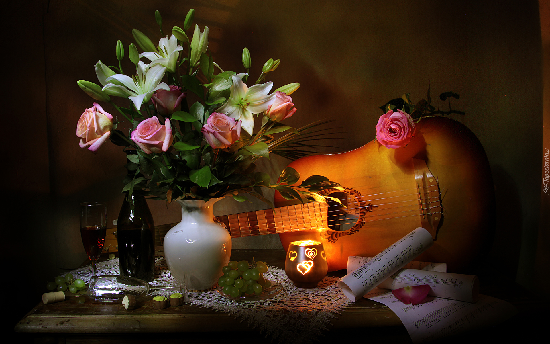 Edytor tapety: Gitara i bukiet kwiatów na komodzie