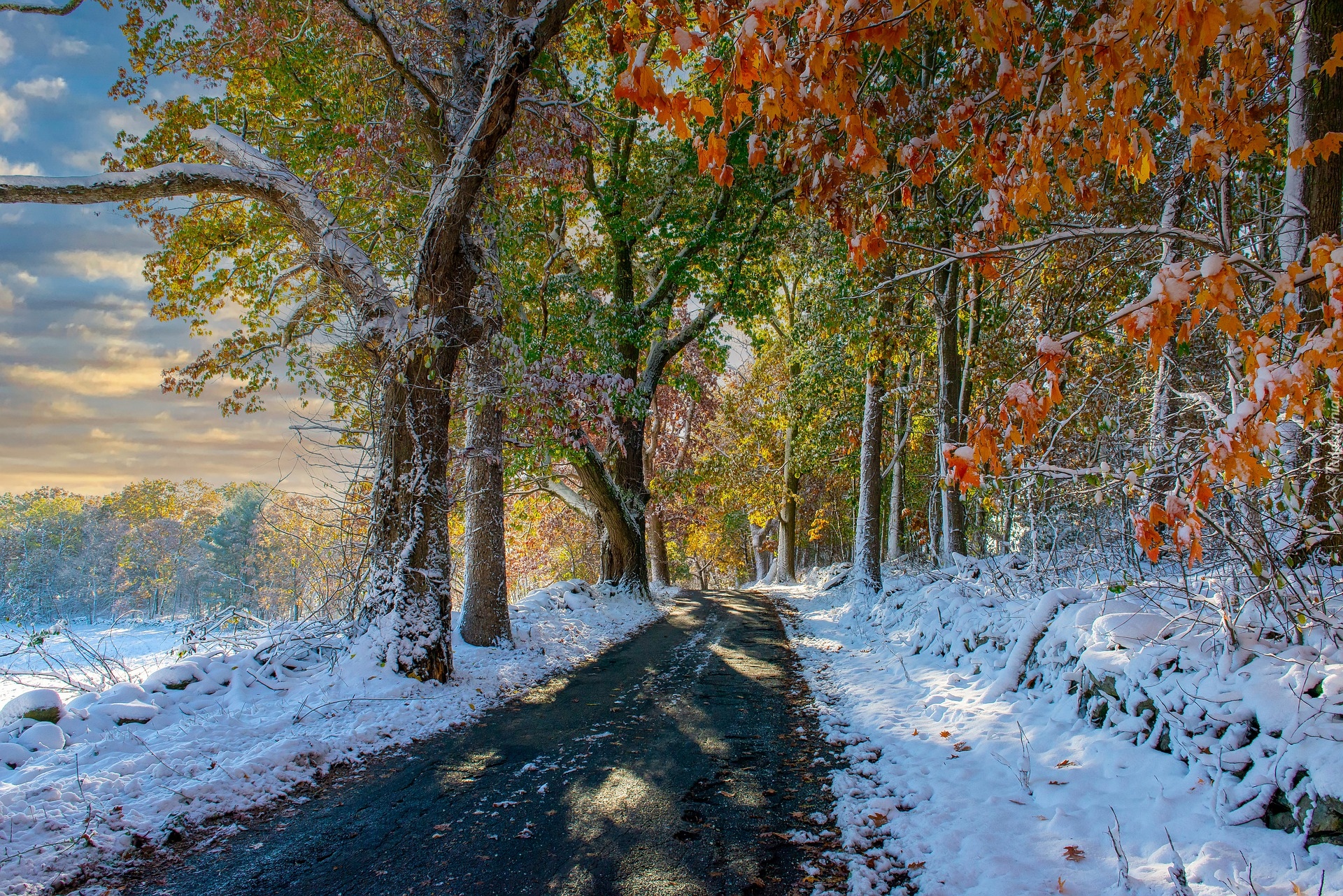 Edytor tapety: Kolorowe jesienne drzewa przy zaśnieżonej drodze