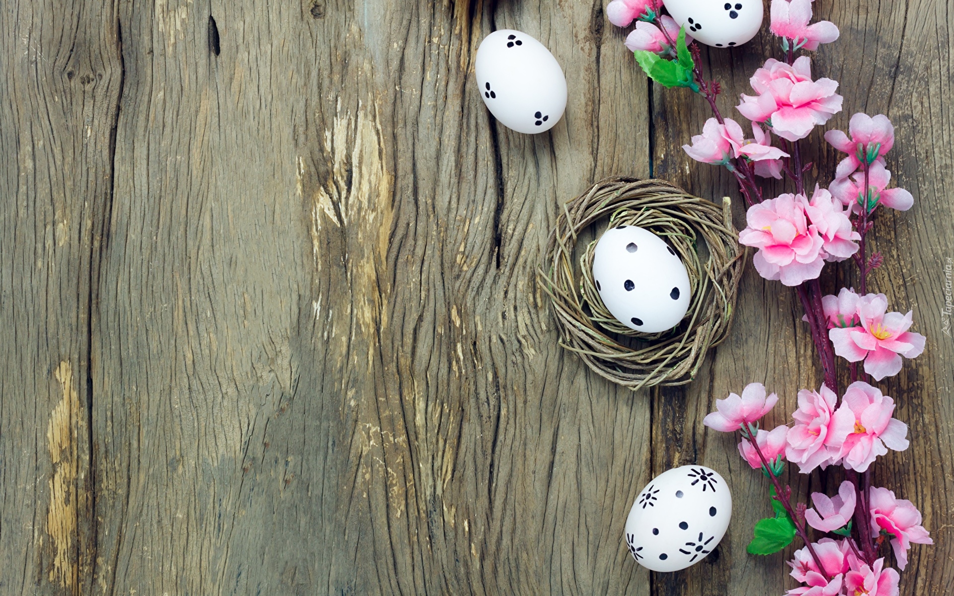 Edytor tapety: Różowe kwiaty i pisanki na desce